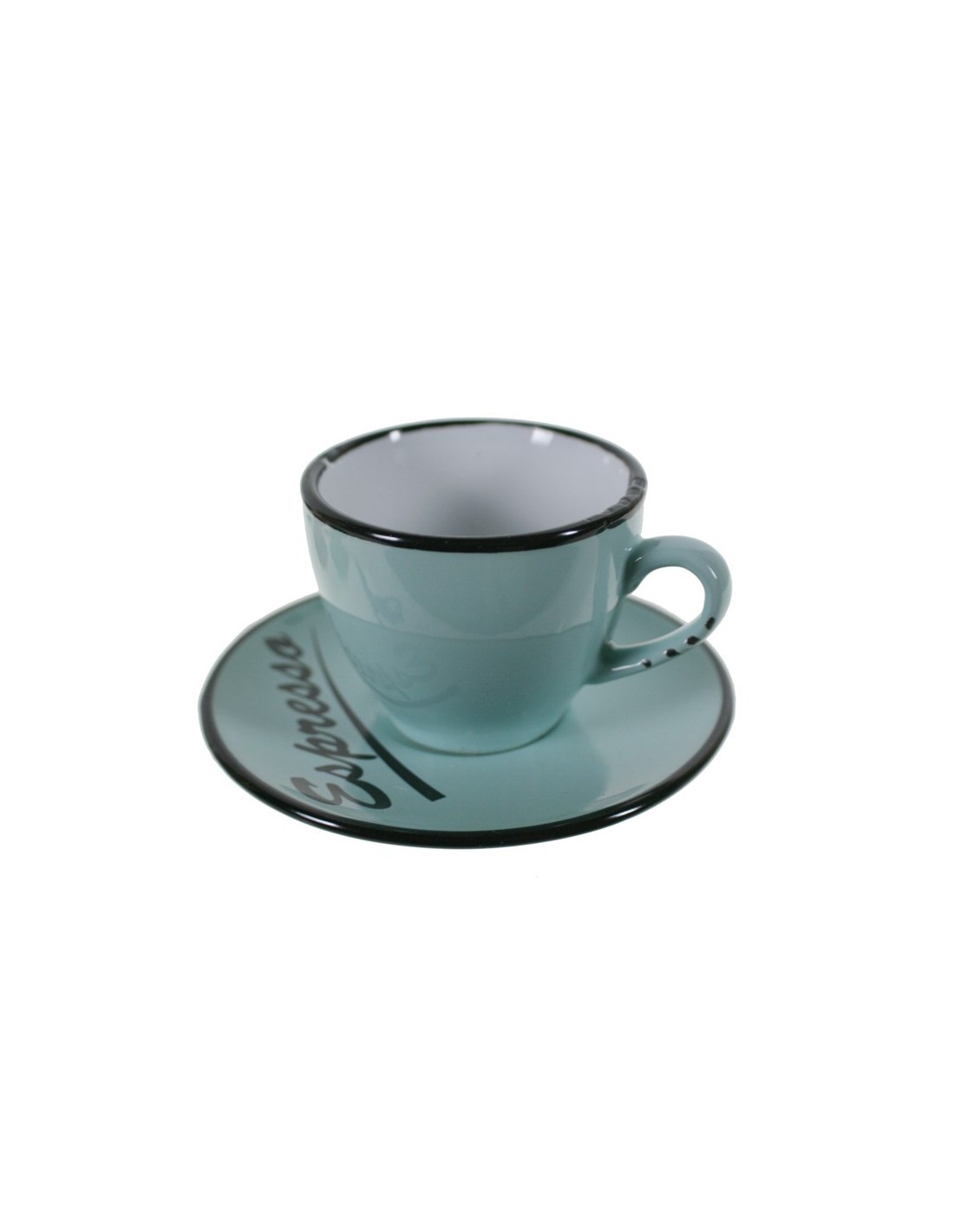 Tasse à café avec assiette de style vintage couleur bleu avec service de table bords noirs. Dimensions : 5x Ø10 cm.