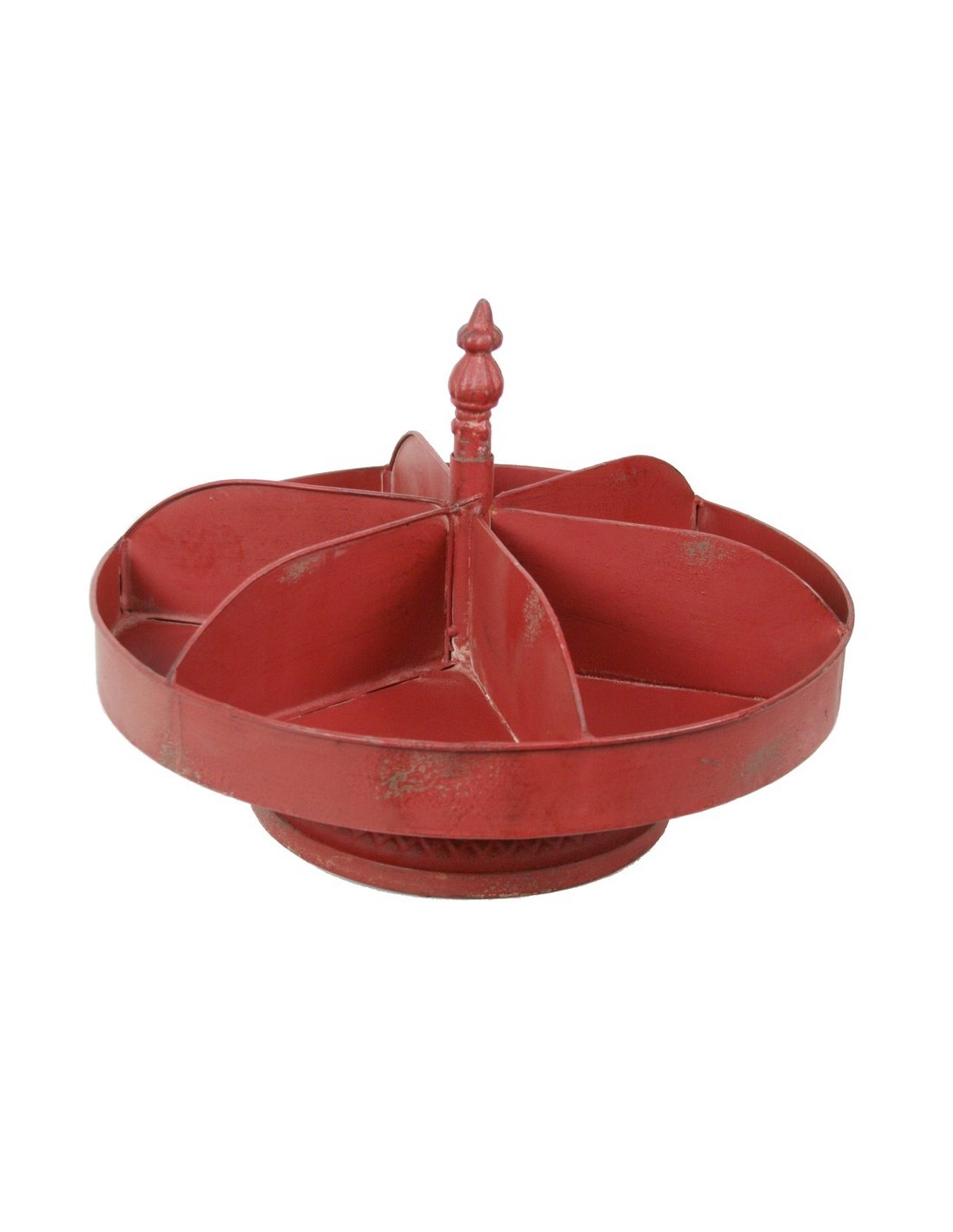 Centre de table ou bol à fruits en métal rouge de style vintage avec séparateurs et base rotative. Parfait pour organiser des chocolats, des bonbons ou des fournitures de bureau. Un cadeau très original.