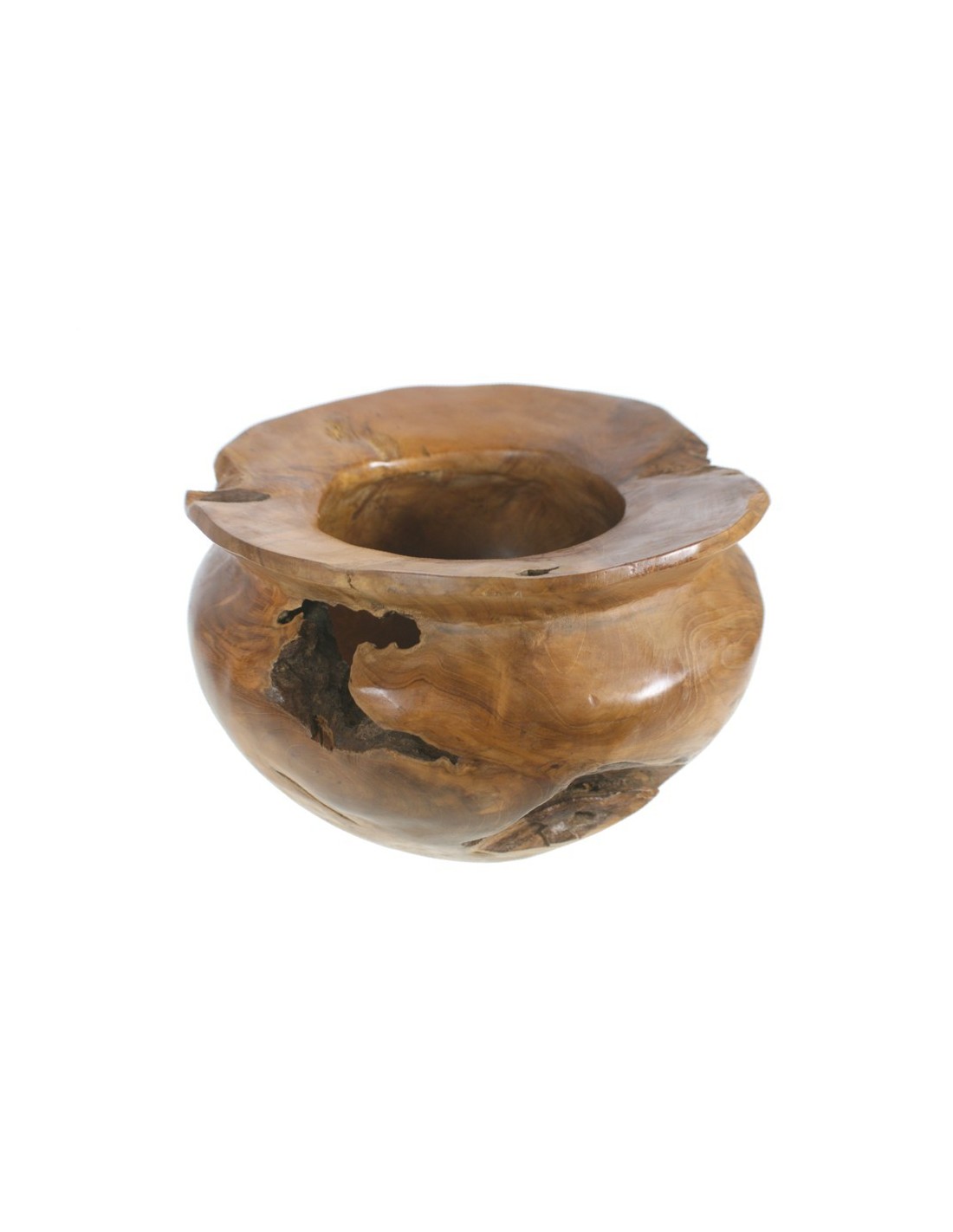 Pièce unique en bois massif d'un seul morceau de teck avec la forme irrégulière et sculptée dans la forme d'un vase. Un objet unique avec une haute valeur décorative qui attirera les regards là où vous le placerez.
