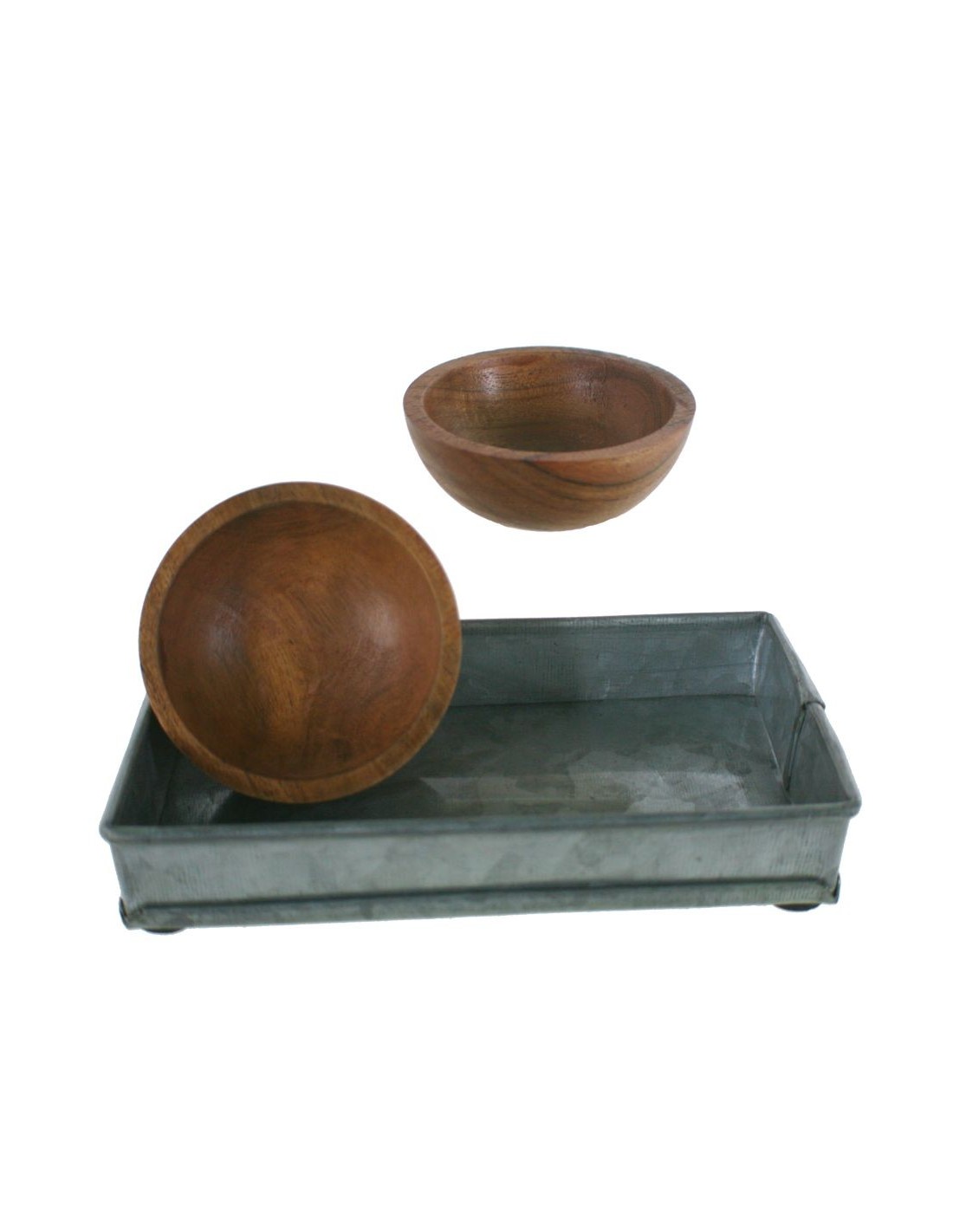 Deux bols en bois de teck massif Ø8 cm présentés sur un plateau en métal couleur étain. Pour la cuisine, la décoration de la maison, le bureau, le bureau,…. Un joli cadeau de style vintage.