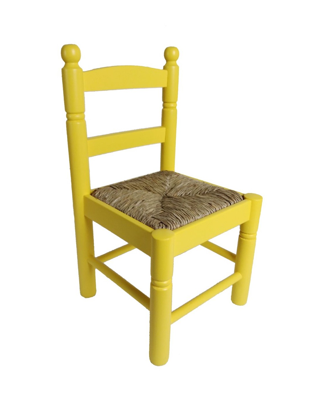 Chaise enfant en pin massif, peinte à la main en jaune, avec une assise traditionnelle en rotin. Idéale pour les petits pour peindre, lire ou jouer. Fabriquée à la main avec de la peinture à l'eau.