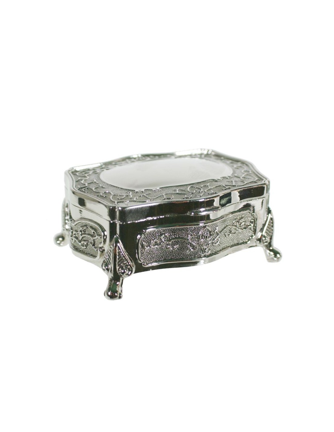Petite boîte à bijoux en métal poli à décor de coiffeuse gravé de style vintage. Dimensions : 3,5x9x7cm.