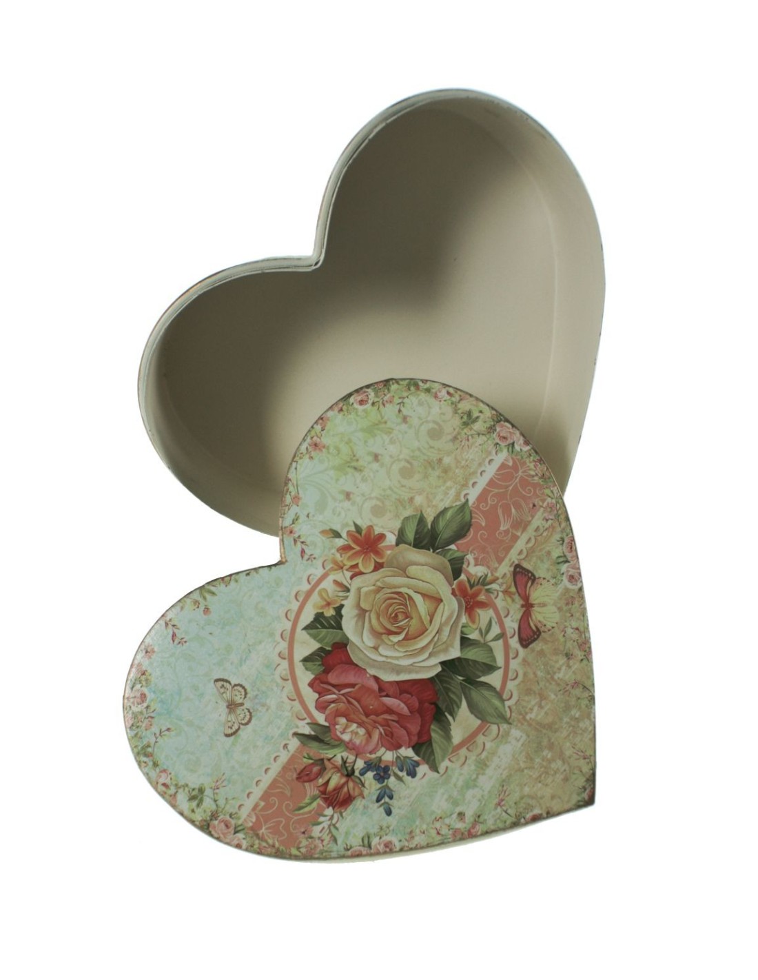 Boîte en forme de cœur de style vintage décorée de fleurs dans des tons pastel. C'est une boîte pour faire un beau cadeau dans un moment unique et inoubliable et pour mettre dedans ce que vous aimez le plus. C'est aussi une boîte très décorative pour votre maison.
