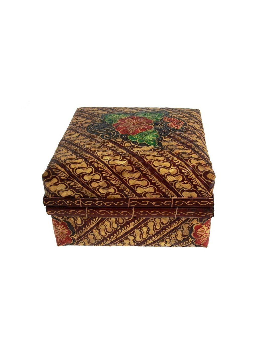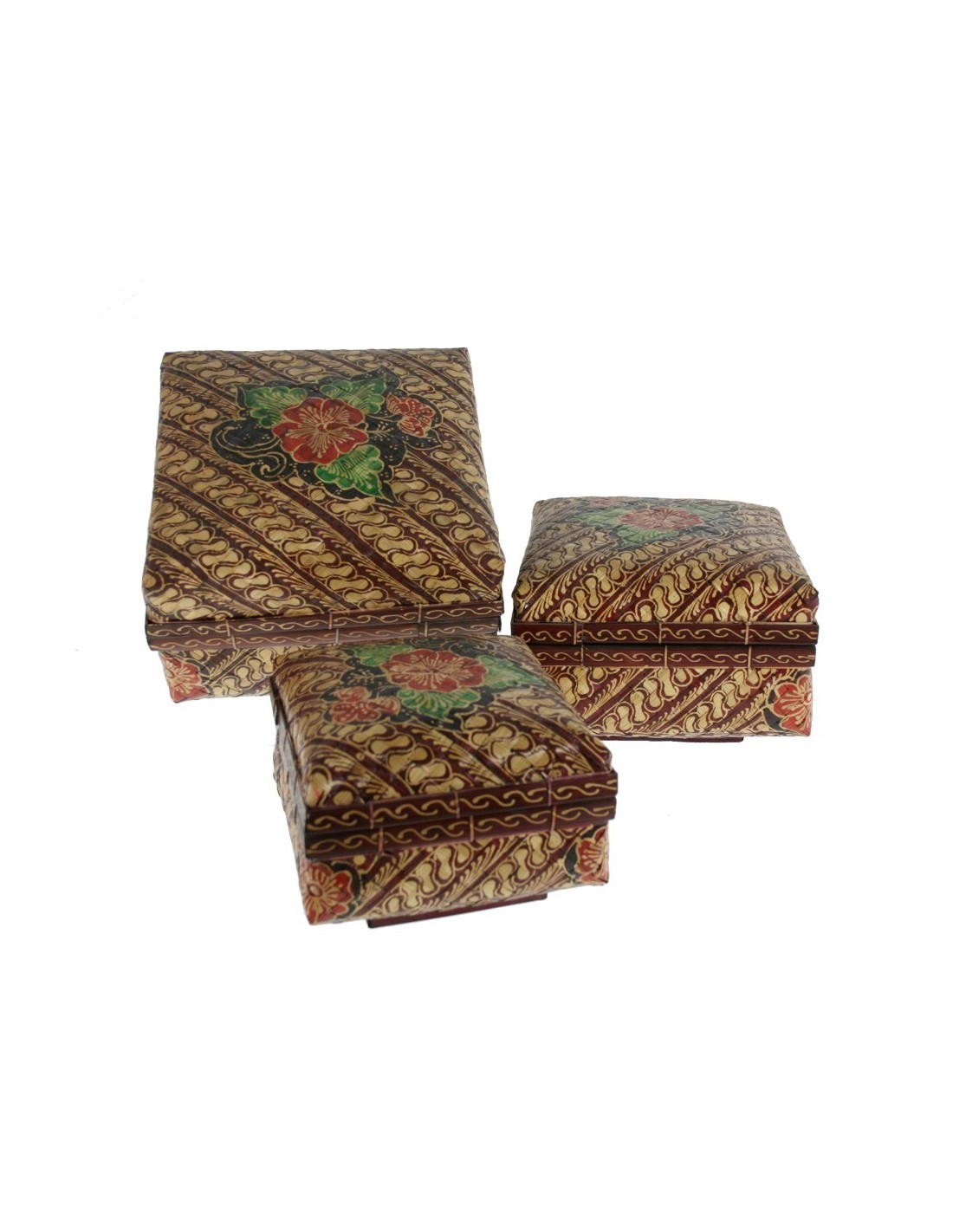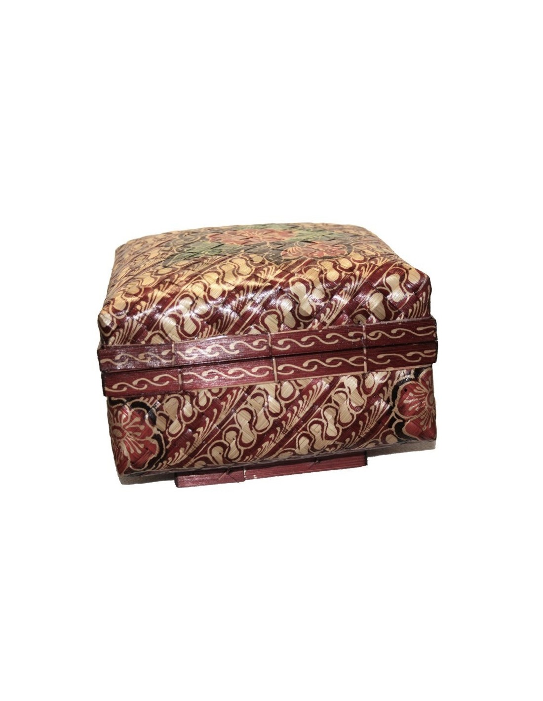 Boîtes décorées en fibre de palmier naturel avec des dessins sur le dessus peints à la main.