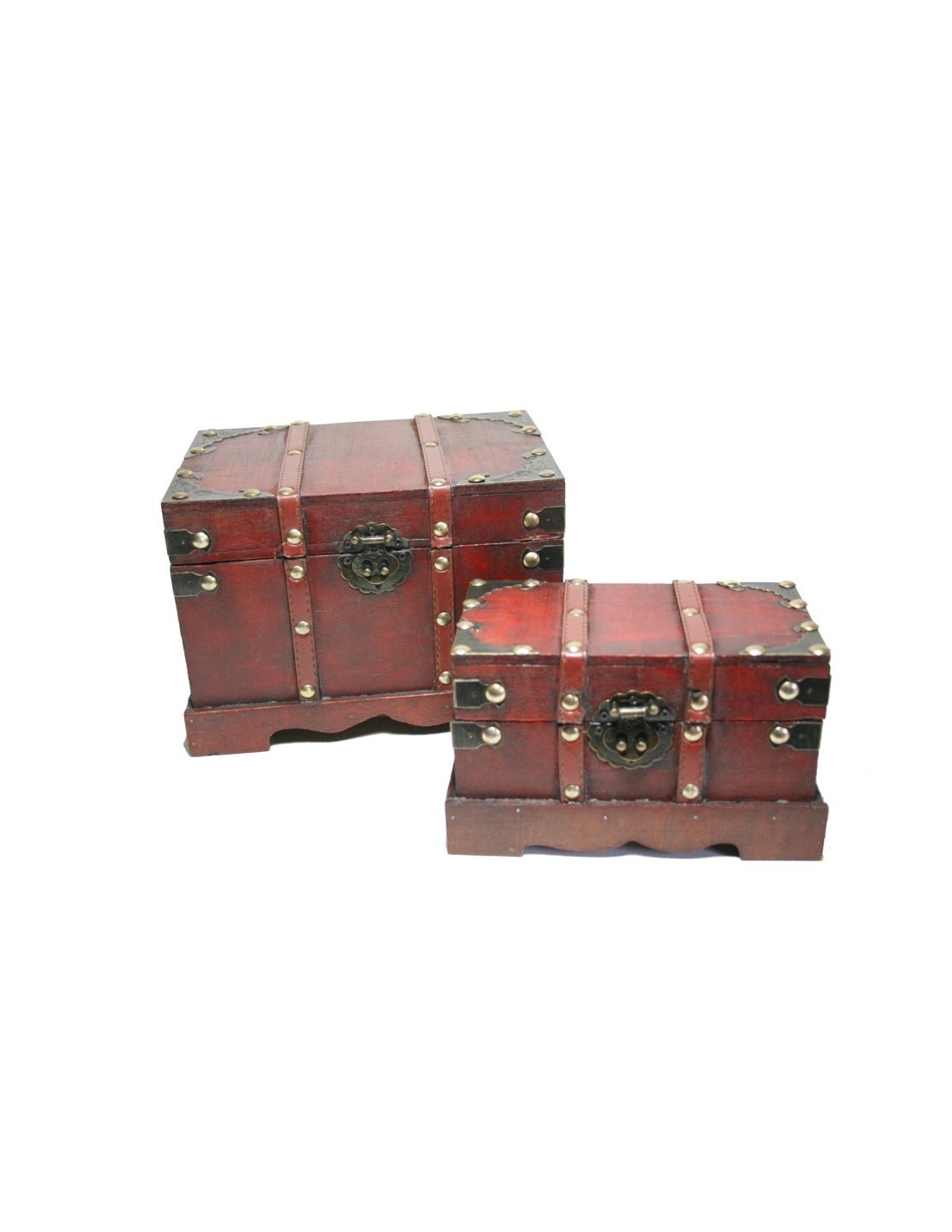 Boîte à bijoux en bois laminé avec sangles en cuir poly et garnitures en métal sur le couvercle et les coins en acajou.