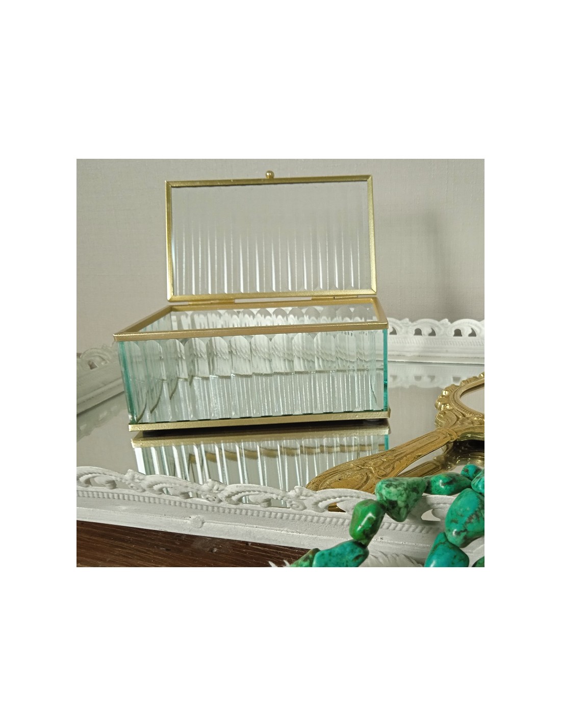 Boîte en verre ondulé et garniture en métal doré et base de miroir de style vintage. Une délicatesse d'une boîte, idéale pour décorer votre maison et en même temps lui donner une utilité de stockage. Si vous êtes une personne romantique et affectueuse, avec cette boîte, vous serez surpris de faire un cadeau spécial.