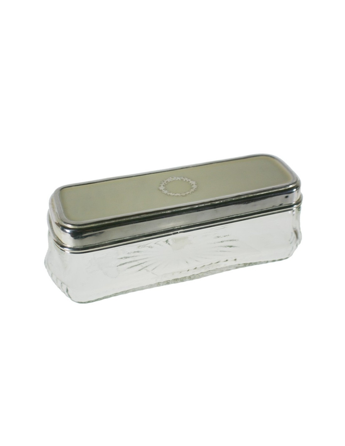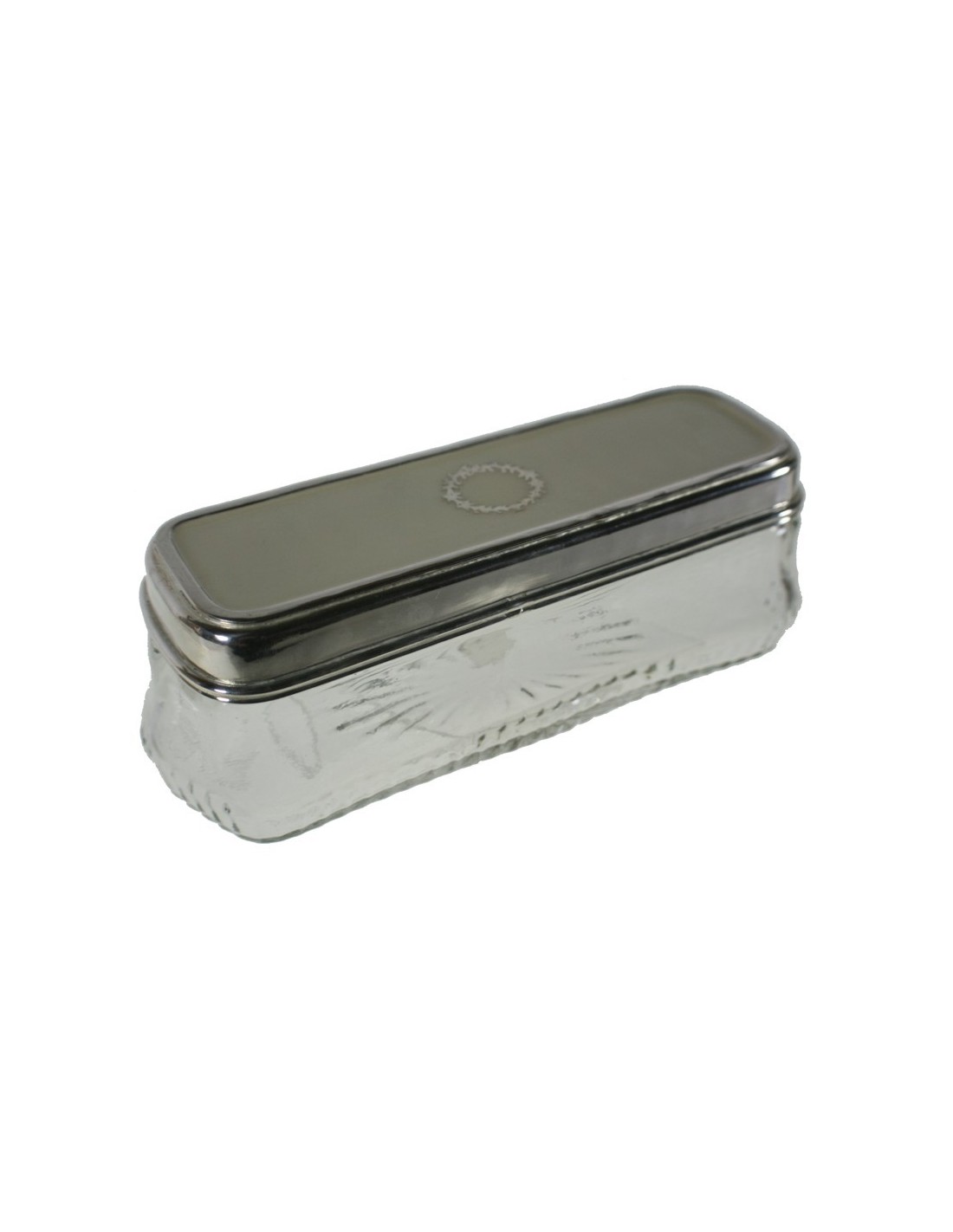 Boîte en cristal avec couvercle en argent, dessin de couronne. Dimensions: 8x24x9 cm.