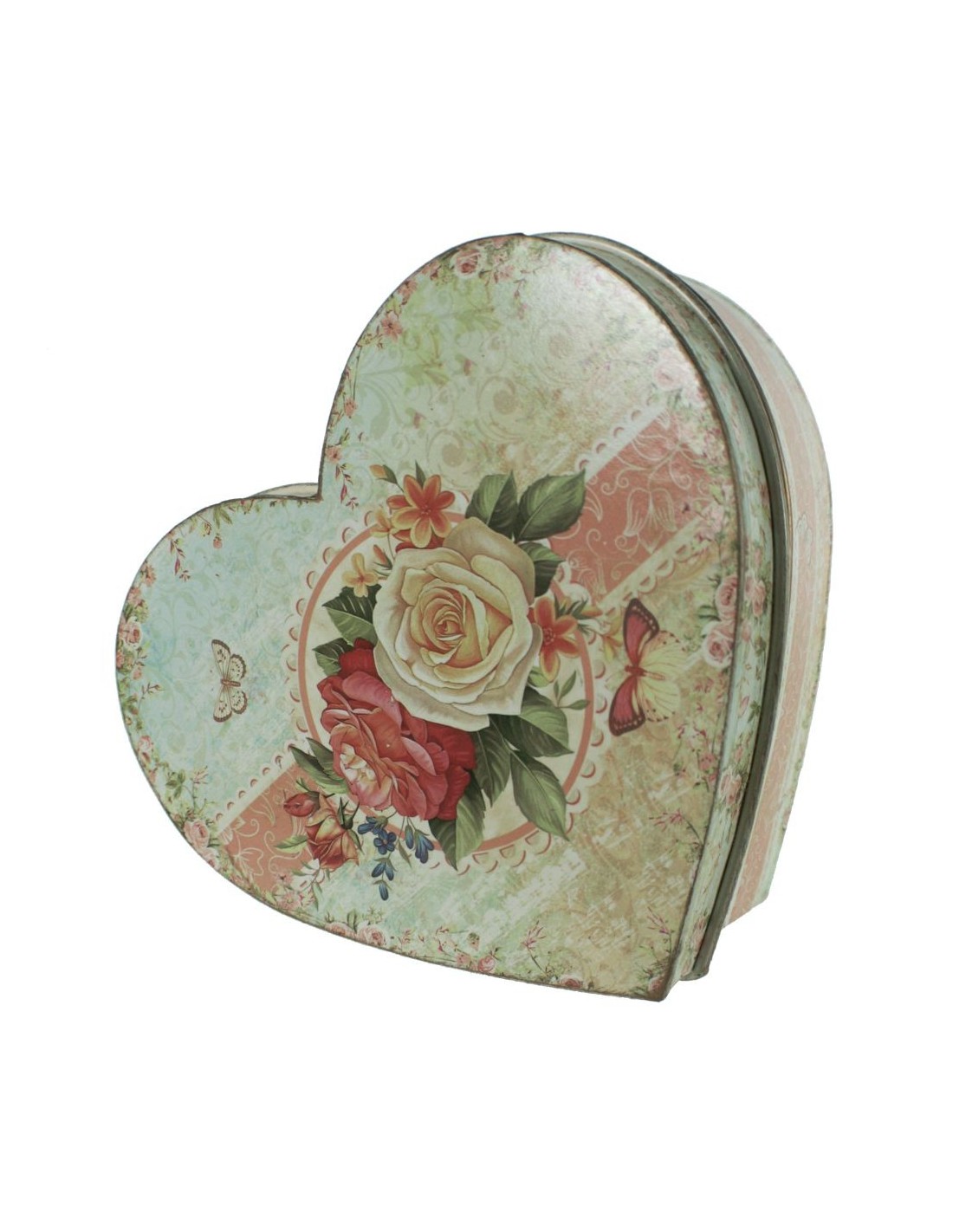 Boîte en métal moyenne en forme de cœur décorée dans un style très romantique, idéale pour décorer votre maison et en même temps lui donner une utilité de rangement. Si vous êtes une personne romantique et affectueuse, avec cette boîte, vous serez surpris de faire un cadeau spécial