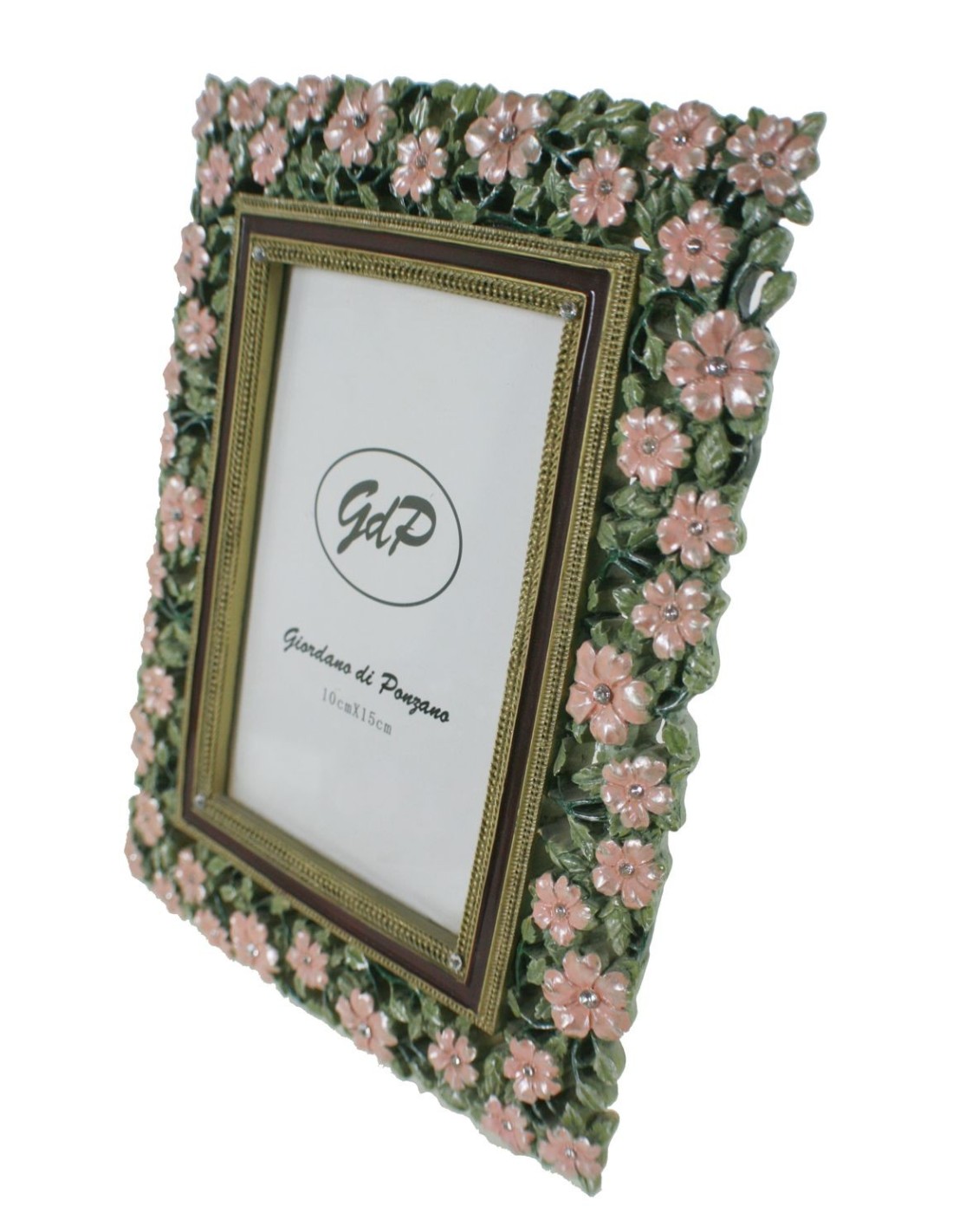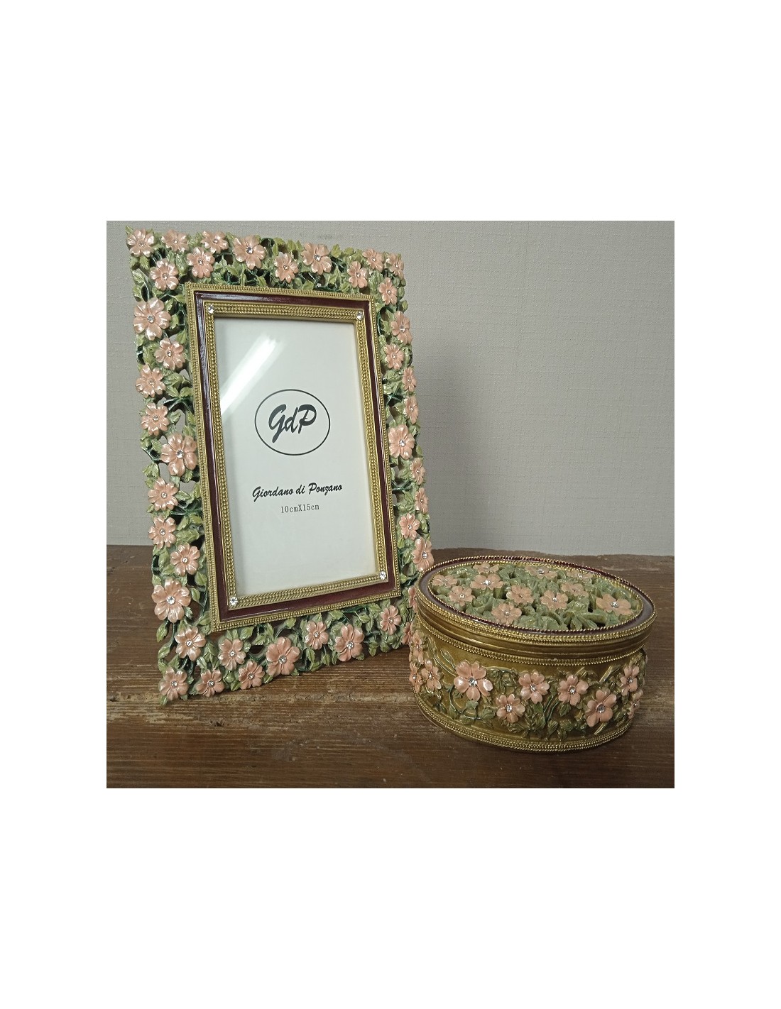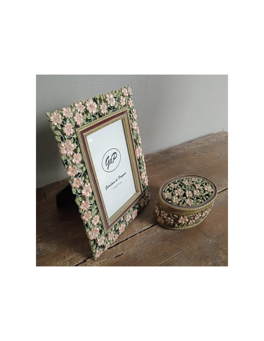 Cadre photo avec boîte à bijoux, décoré de fleurs et strass en résine verte. Dimensions : 23x18 cm.