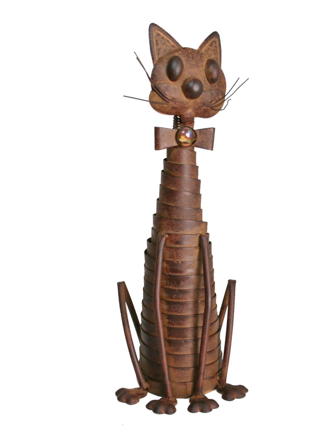 Chat assis en métal couleur rouille avec éléments mobiles pour décorer la maison ou le jardin.