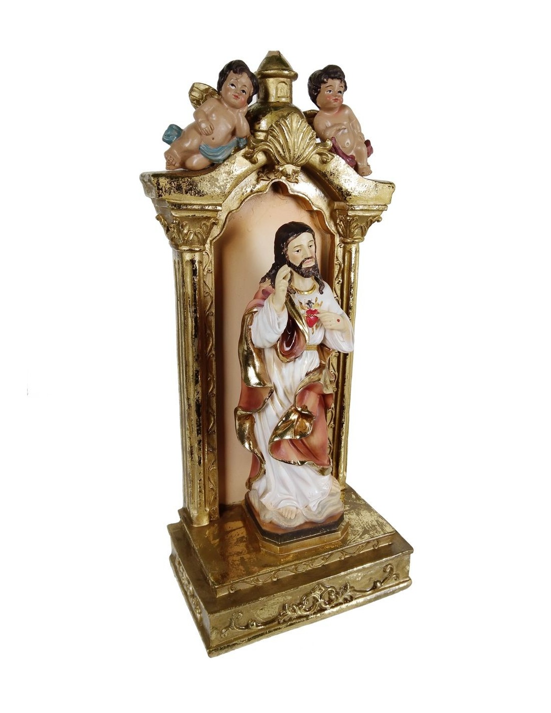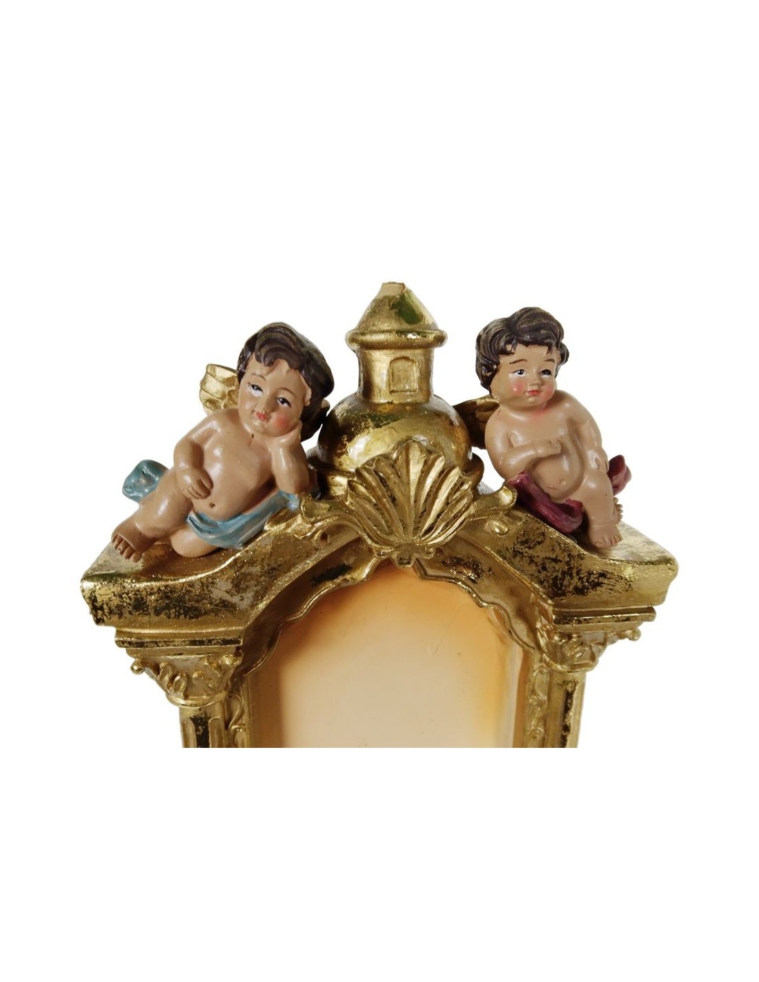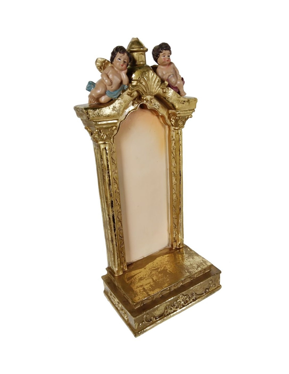 Élégante niche en résine dorée avec anges dans le dôme, idéale pour exposer des personnages jusqu'à 19 cm de hauteur. Un complément décoratif parfait pour les lieux de culte ou pour embellir n'importe quel coin de votre maison.