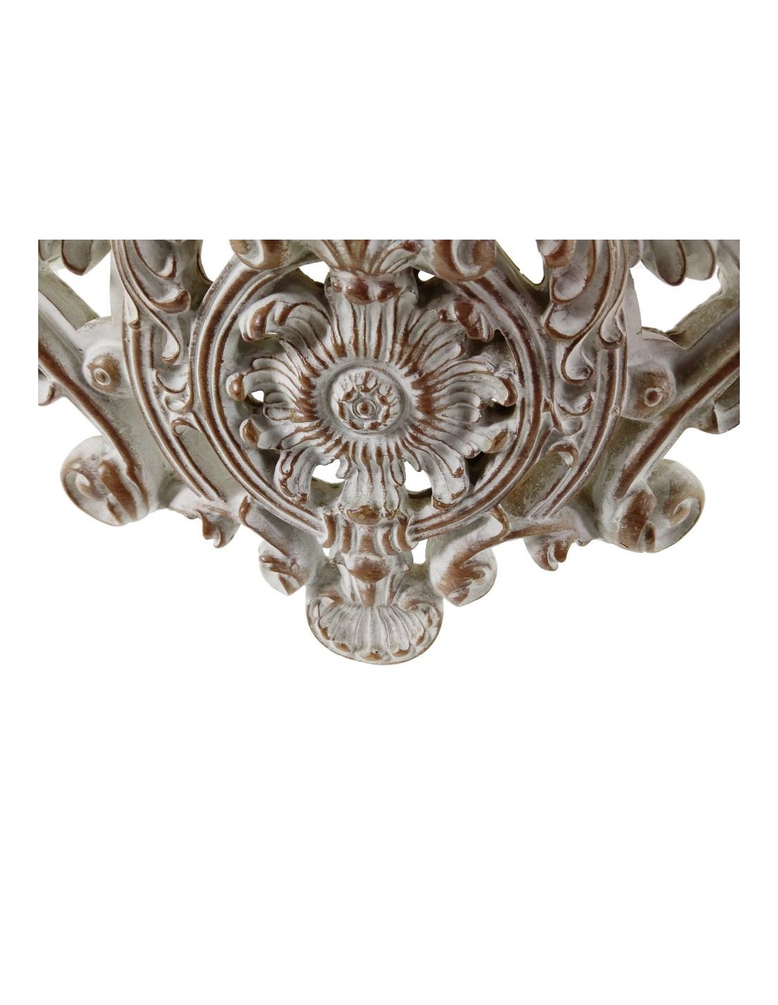 Support d'étagère incurvé à accrocher au mur avec décoration centrale. Structure en résine finition blanc patiné à haute valeur décorative.