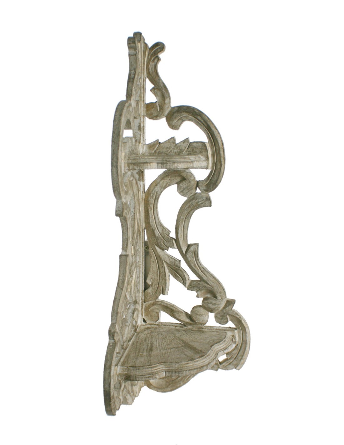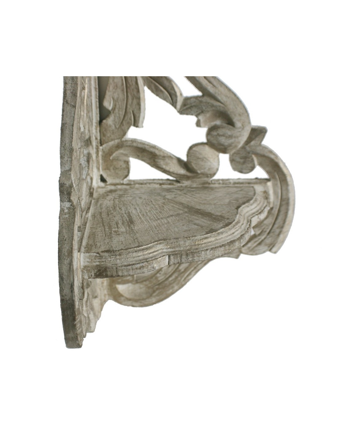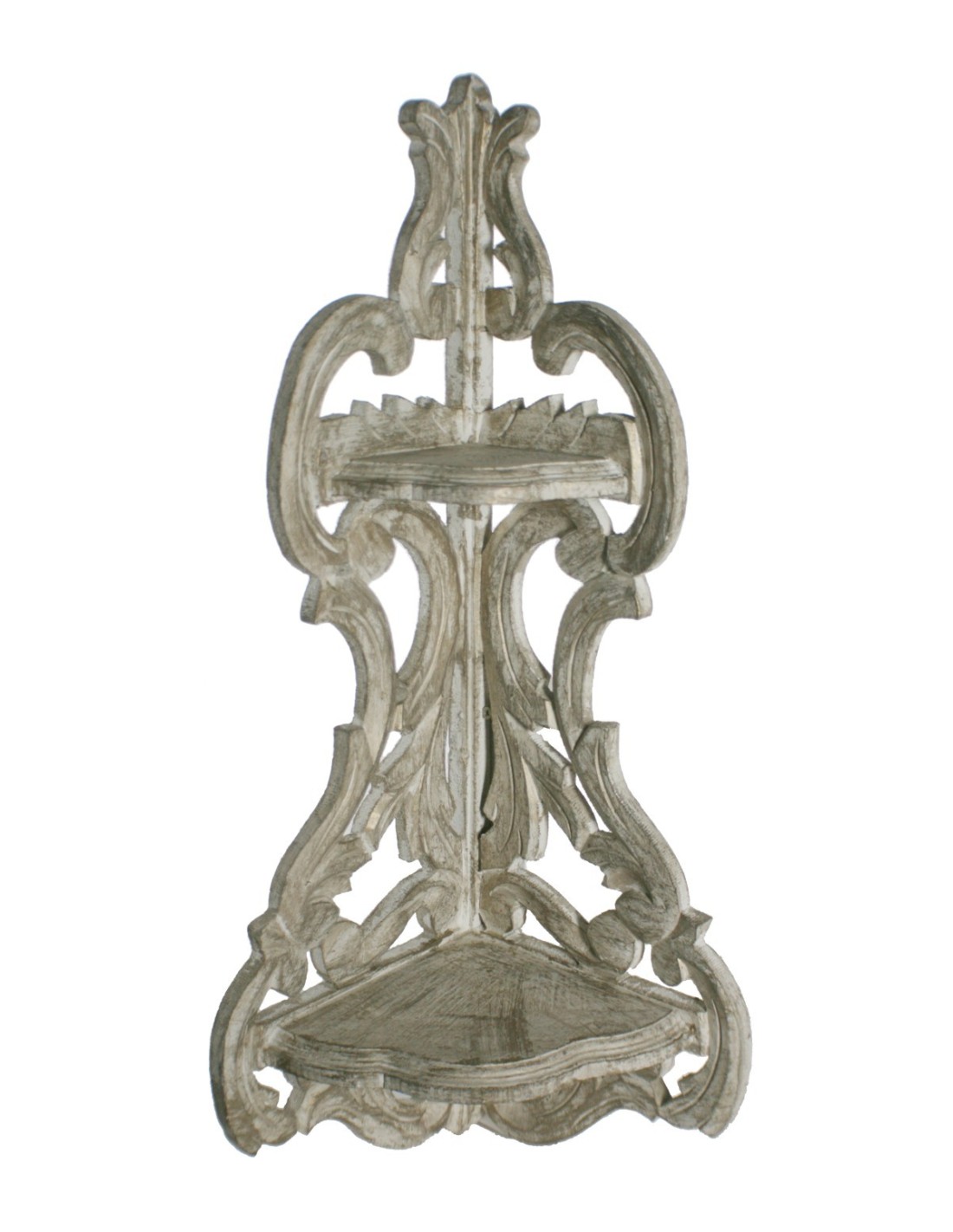 Cette étagère à deux niveaux est idéale pour profiter des coins et ajouter une touche décorative élégante. Sa finition patinée blanc crème met en valeur les détails sculptés à la main, créant un style rustique et charmant.
