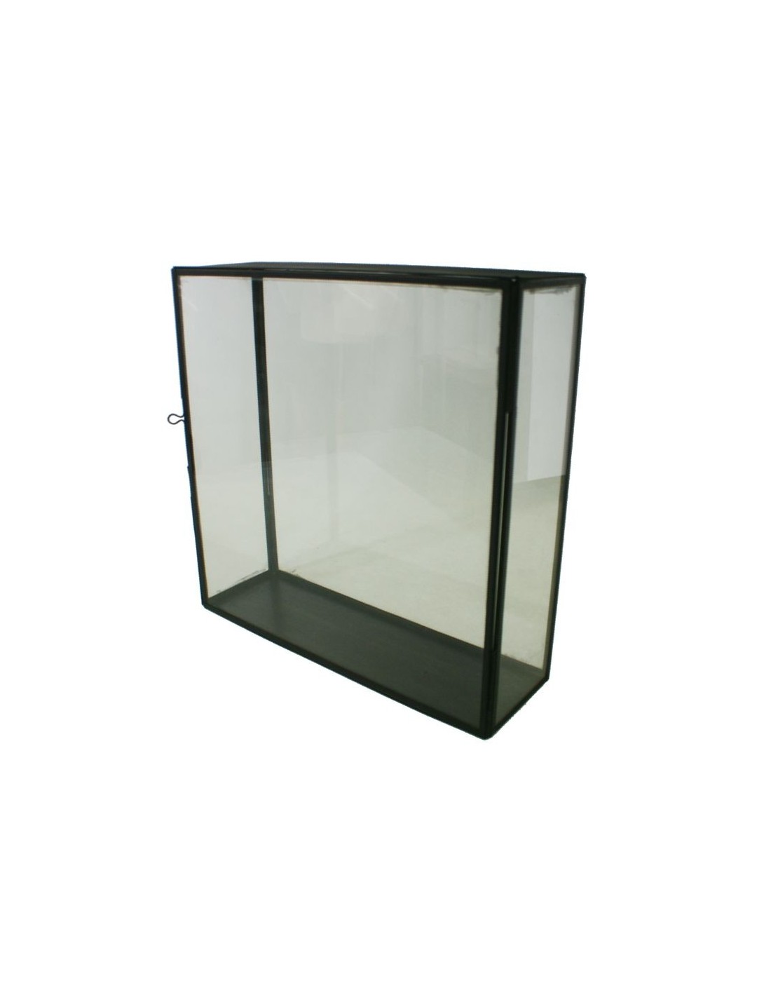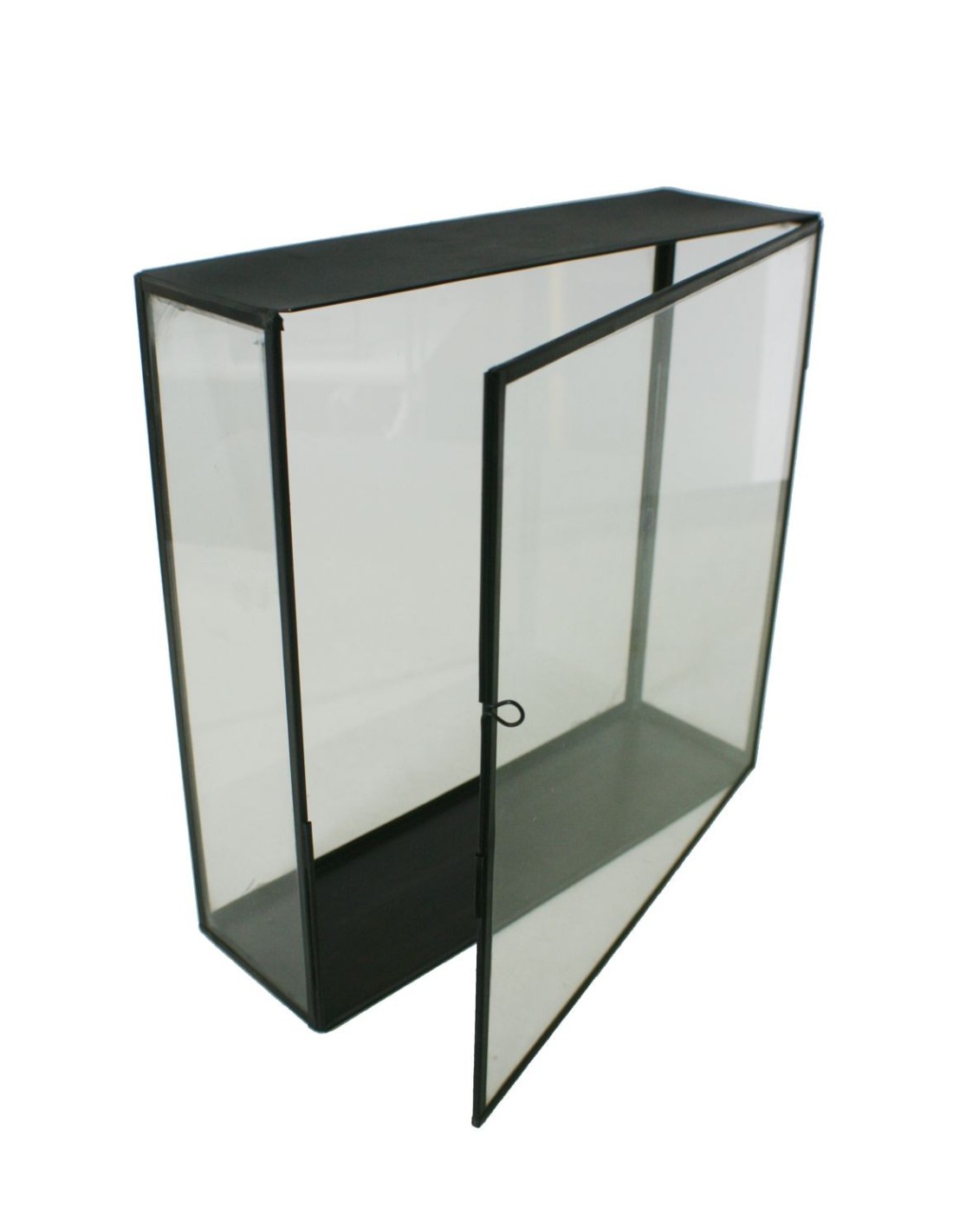 Urne rectangulaire en verre avec une structure en métal en finition oxyde. Il dispose d'une porte centrale à large accès, parfaite pour exposer des objets décoratifs et des collections spéciales.