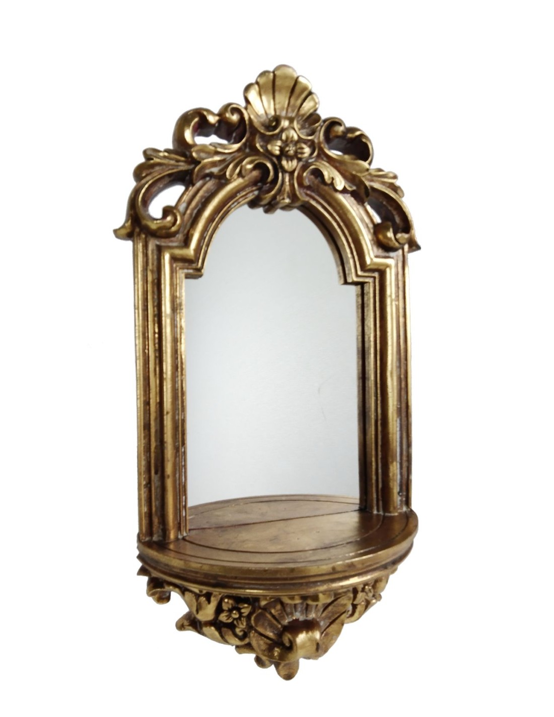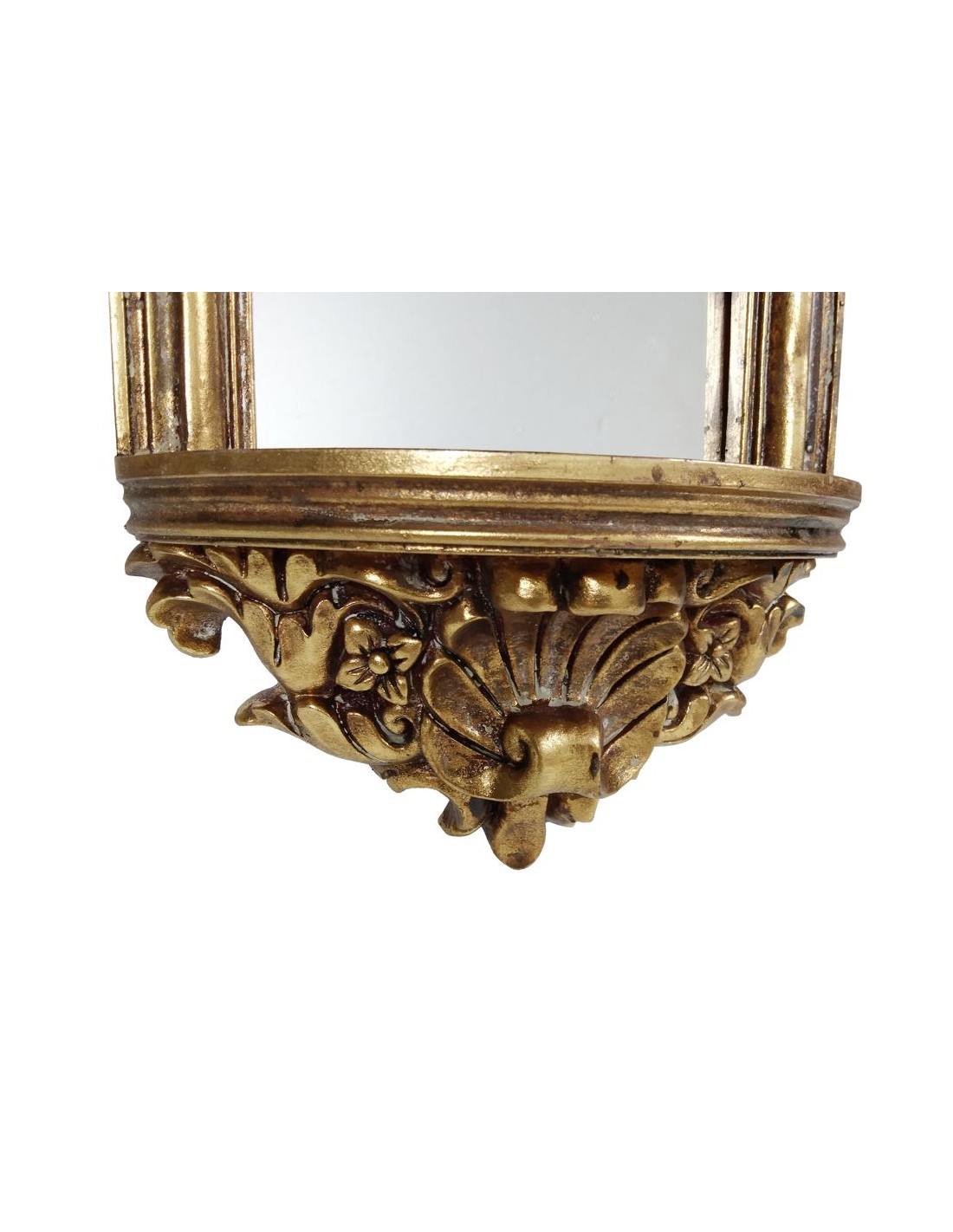 Élégante console de suspension avec miroir, une pièce de décoration indispensable pour mettre en valeur et honorer les images religieuses. Ce support a un design exquis, avec une finition en résine patinée couleur or qui lui donne une touche de distinction. Il ajoute également un élément décoratif unique à votre espace.