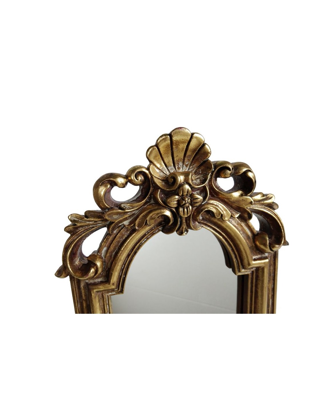 Support de suspension avec miroir fini en résine de couleur or patinée vieillie. Dimensions : 43x23x10 cm.