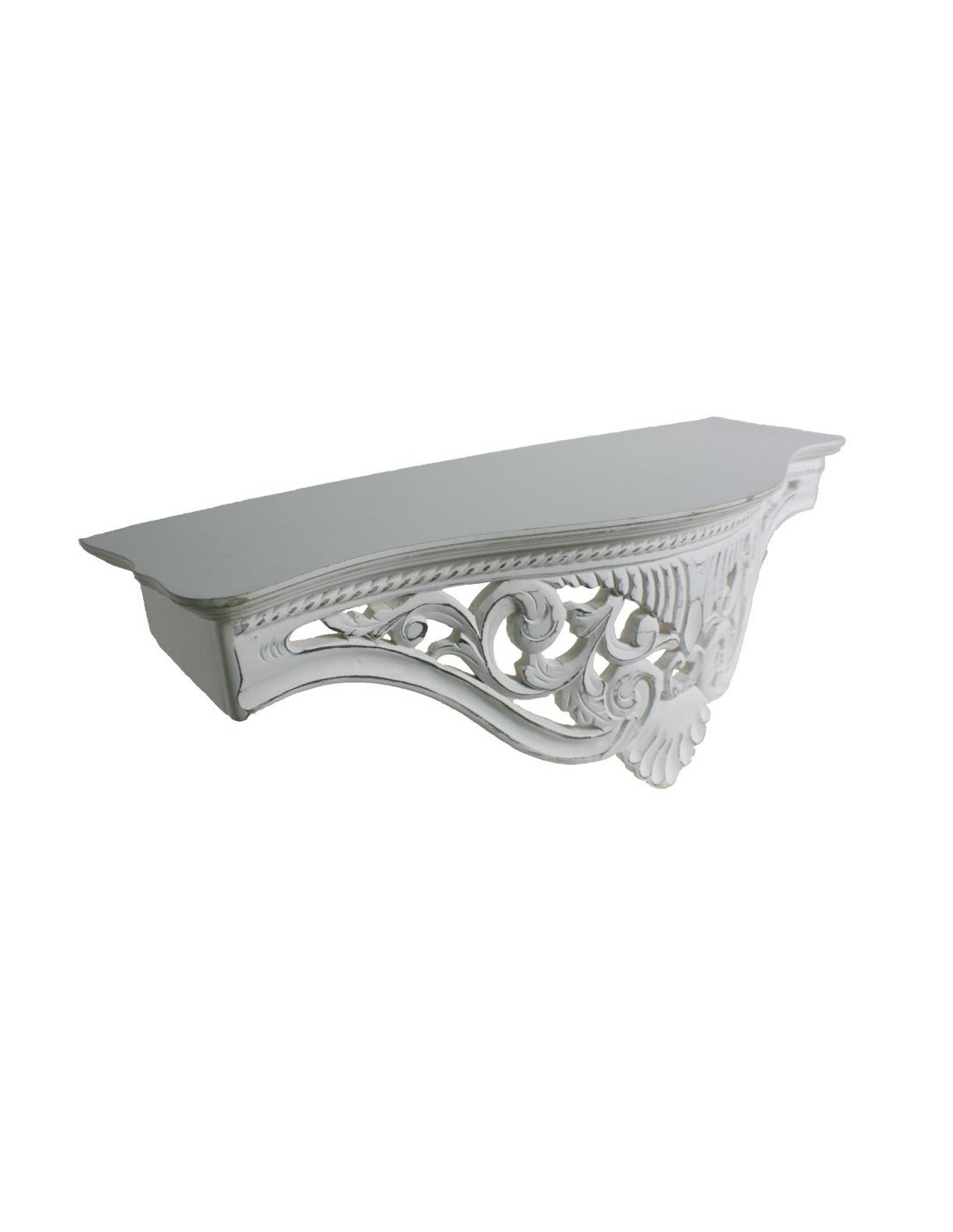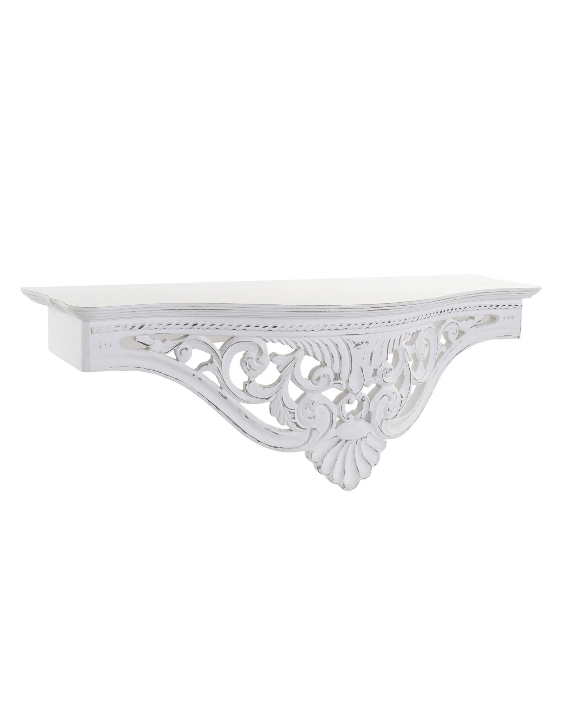 Étagère en bois de manguier sculpté à la main à accrocher au mur. Finition blanche légèrement patinée sur le devant. Cette étagère est très utile et très décorative, vous ne pouvez pas la manquer dans votre maison car il y a toujours une place disponible dans la chambre, l'évier de la cuisine... ou pour compléter un meuble. Dimensions totales : 27x74x28 cm.