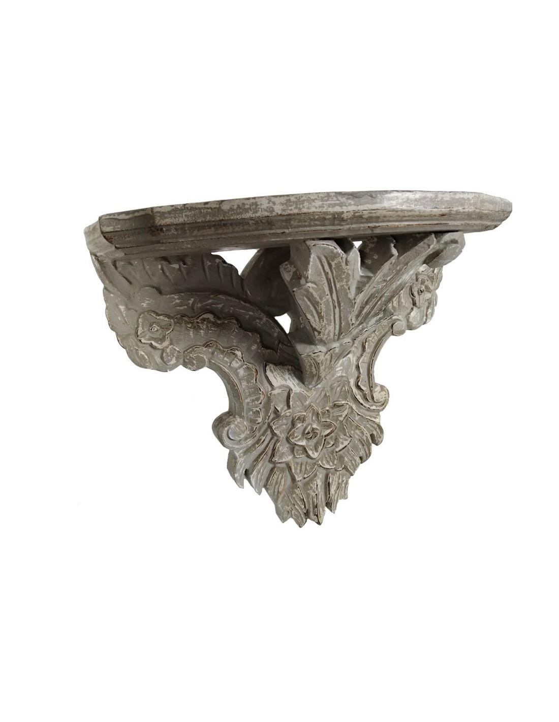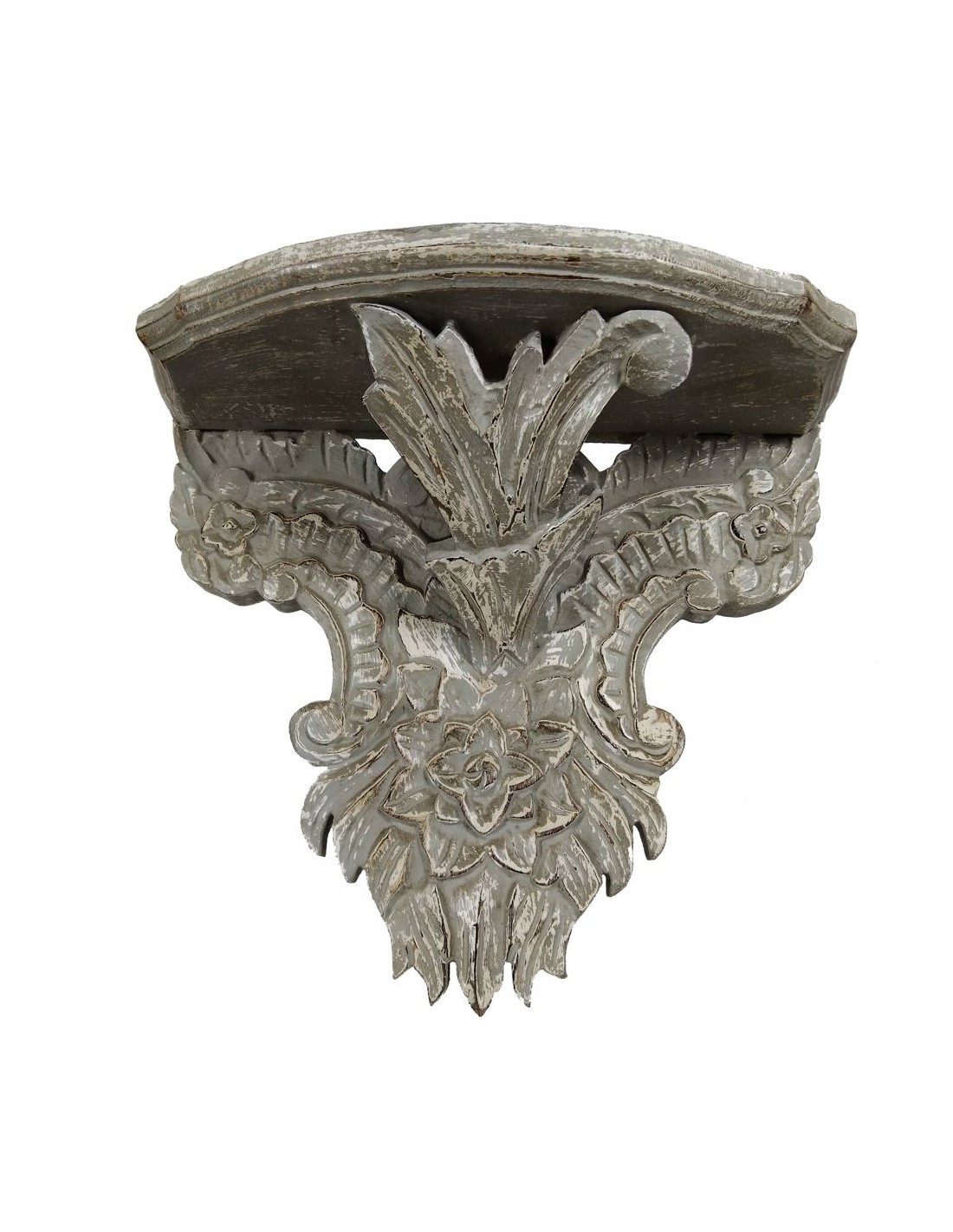 Support ovale en bois massif sculpté manuellement de couleur gris vieilli à suspendre. Dimensions : 31x35x16 cm.