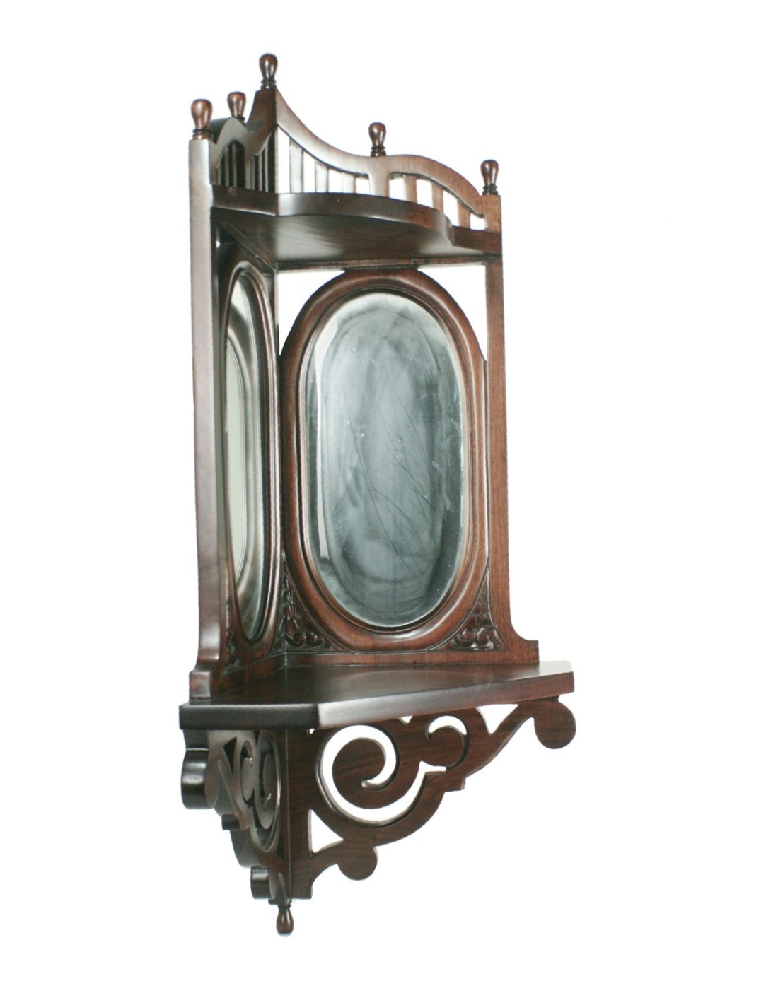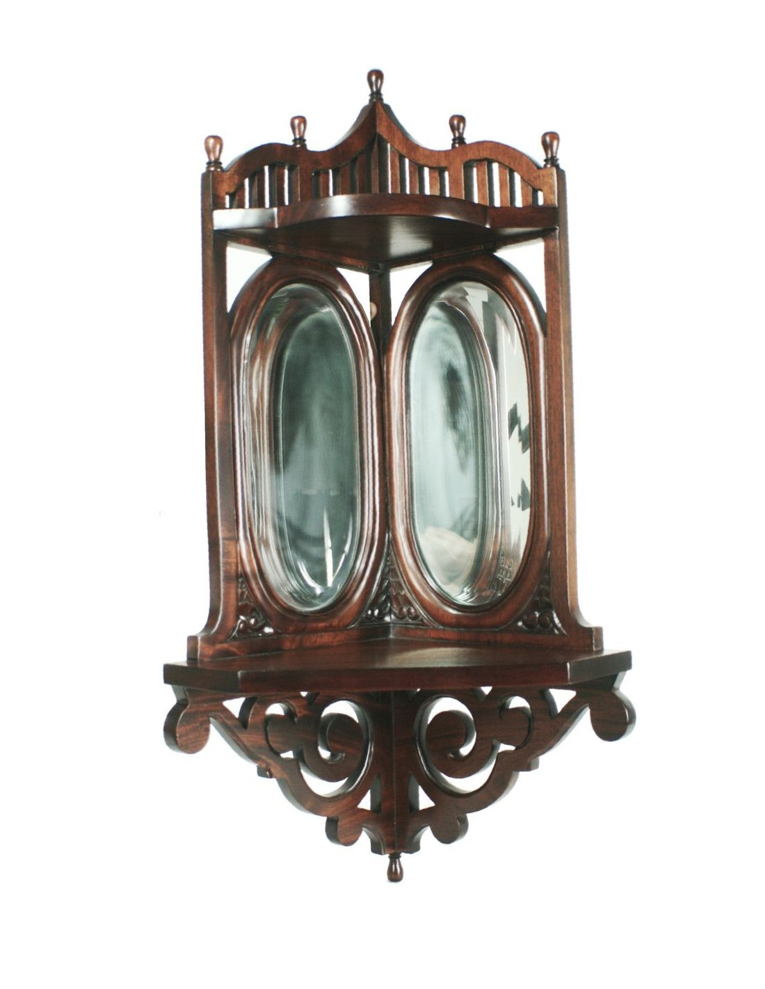 Console d'angle en acajou avec sculptures et miroirs biseautés.