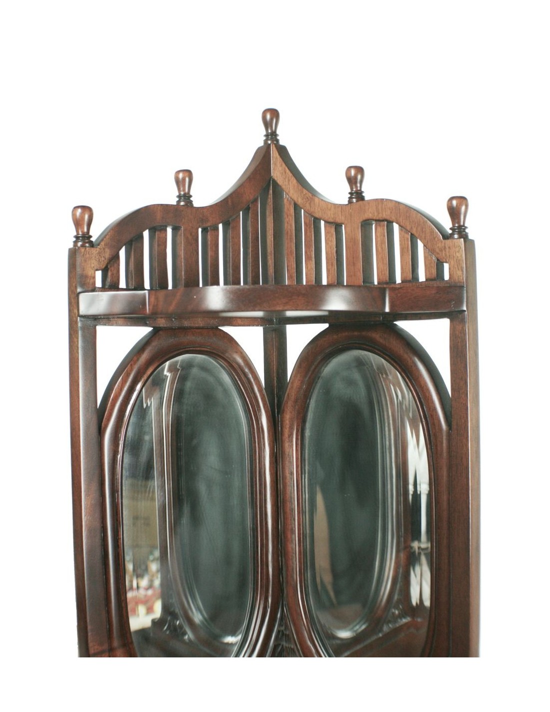Fabriquée en acajou massif, cette console d'angle présente des sculptures artisanales et des miroirs biseautés qui reflètent la lumière et agrandissent visuellement l'espace. Elle est parfaite pour créer un point focal dans un salon, un couloir ou une chambre sans prendre trop de place.