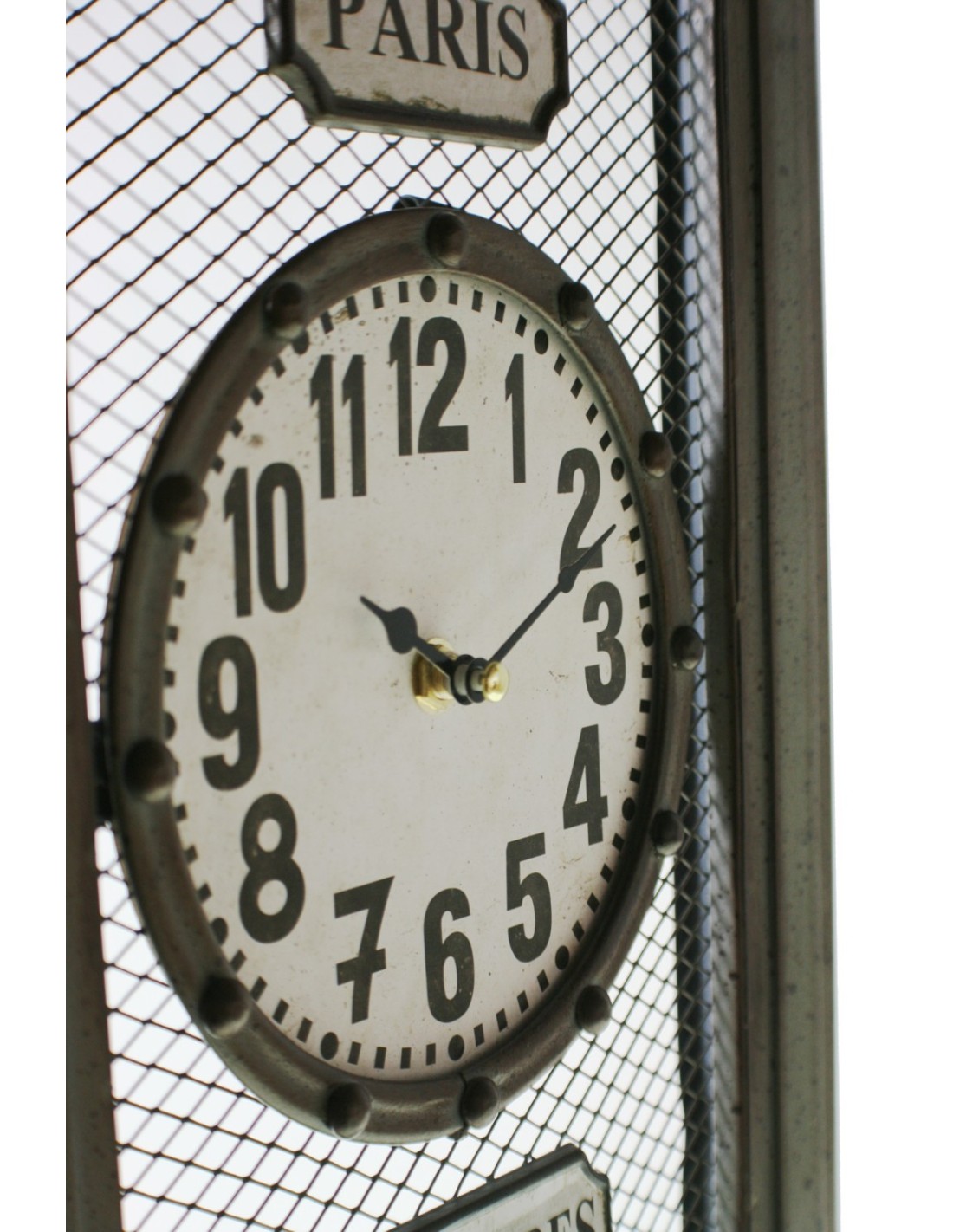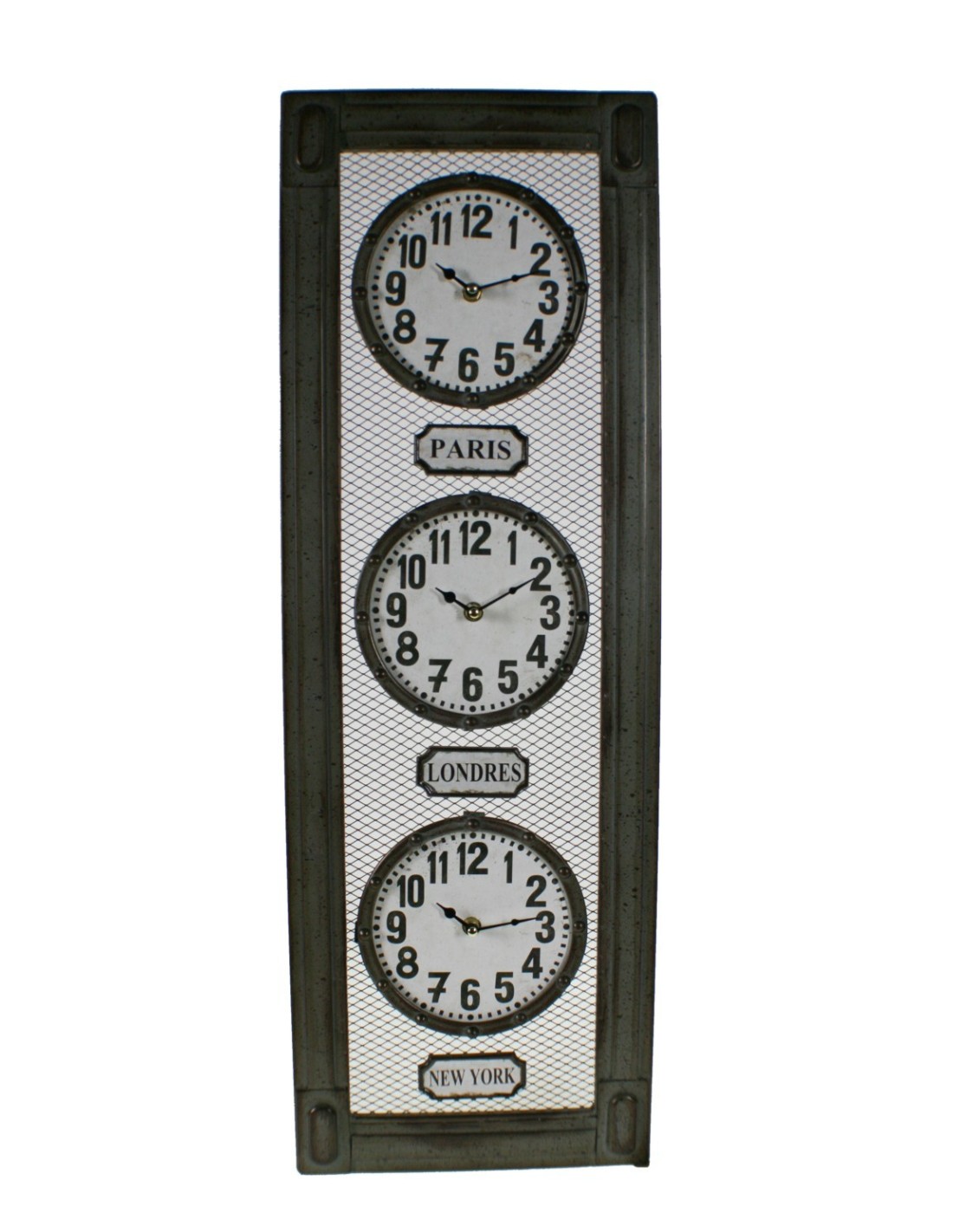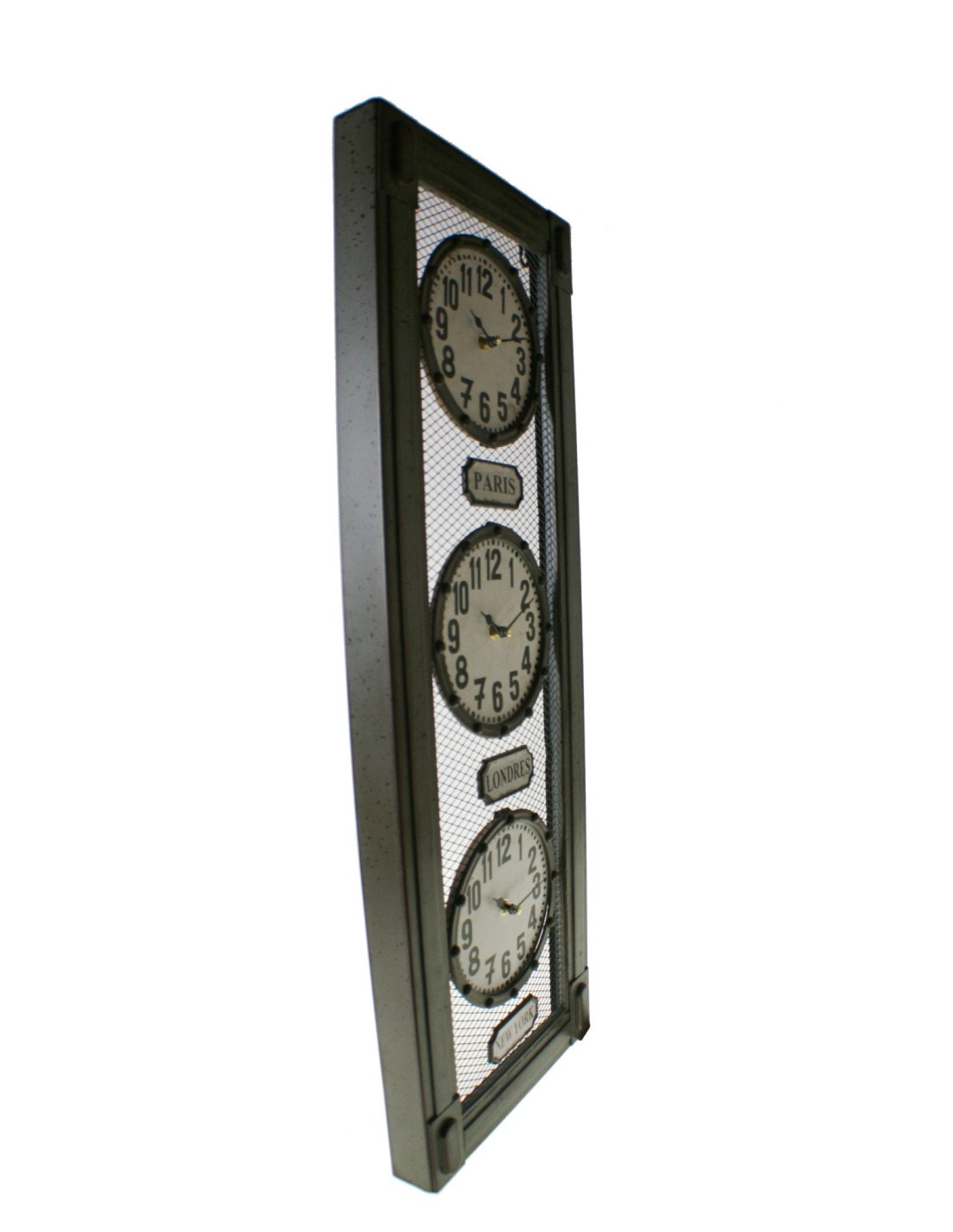 Horloge murale et forme rectangulaire très décorative en métal avec trois sphères de fuseaux horaires différents Paris, Londres, New York. Apportez cette touche unique et distinguée à la pièce de votre maison avec cette horloge murale car c'est une pièce décorative qui donnera de la personnalité.