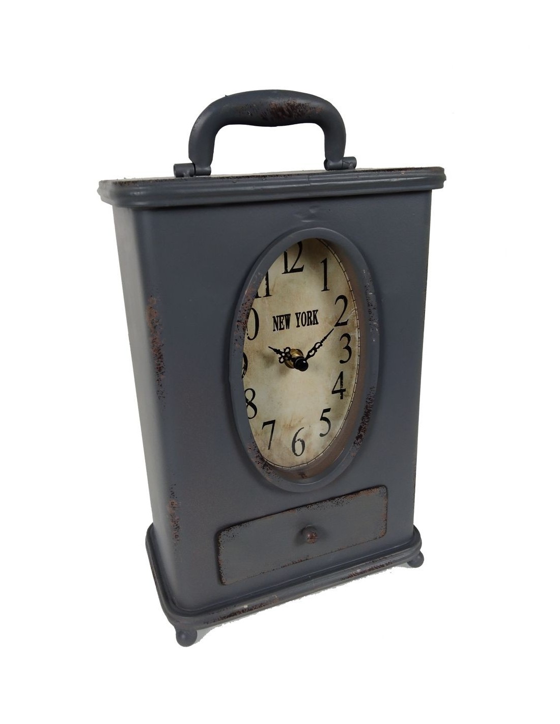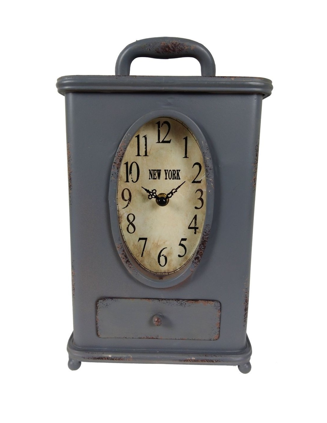Horloge de table avec boîtier en métal gris vieilli, sphère en verre et tiroir inférieur pratique de style vintage.