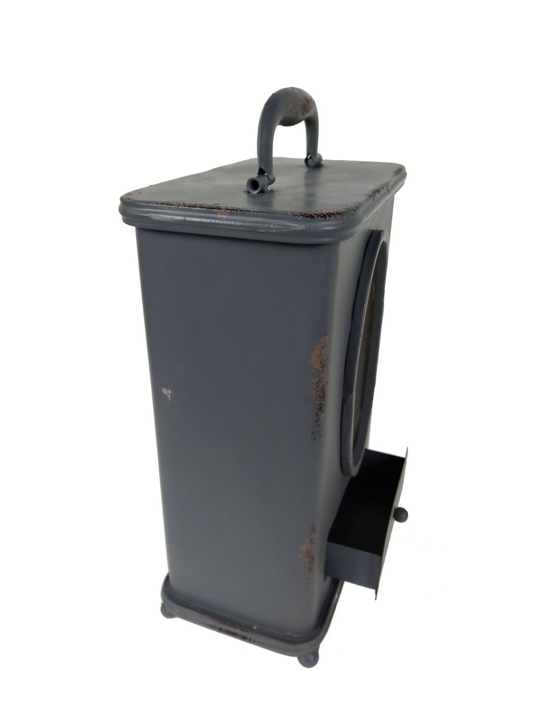 Horloge de table avec boîtier en métal gris vieilli, sphère en verre et tiroir inférieur pratique de style vintage. Il a une poignée pour le transport et dans l'ensemble un look très rétro. Fonctionne sur piles, non incluses.