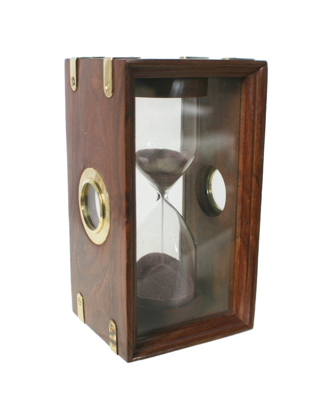 Sablier de table présenté dans une vitrine en teck avec des applications métalliques. Une horloge à porter sur l'étagère ou dans le hall de votre maison. Il s'adapte à toute décoration. C'est aussi un cadeau parfait pour les amateurs de montres et les collectionneurs. Cette montre a un temps de décharge de 5 minutes et est parfaite comme décoration marine.