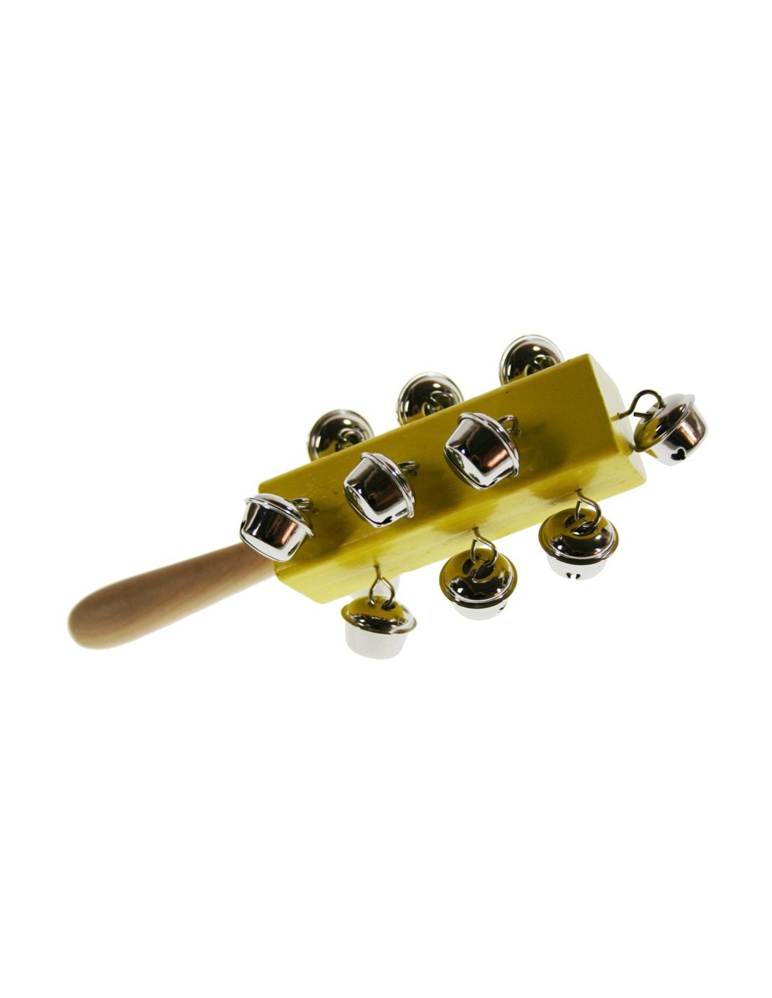 Jouet traditionnel d'instrument de musique acoustique pour enfants de hochet de cloche en bois jaune. Dimensions : 20x7x7 cm.