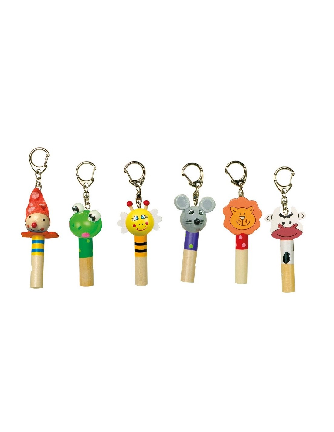 Porte-clés sifflet en bois avec charme animal pour enfants aventureux, idéal comme cadeau. Dimensions : 7,5x3,5 cm.