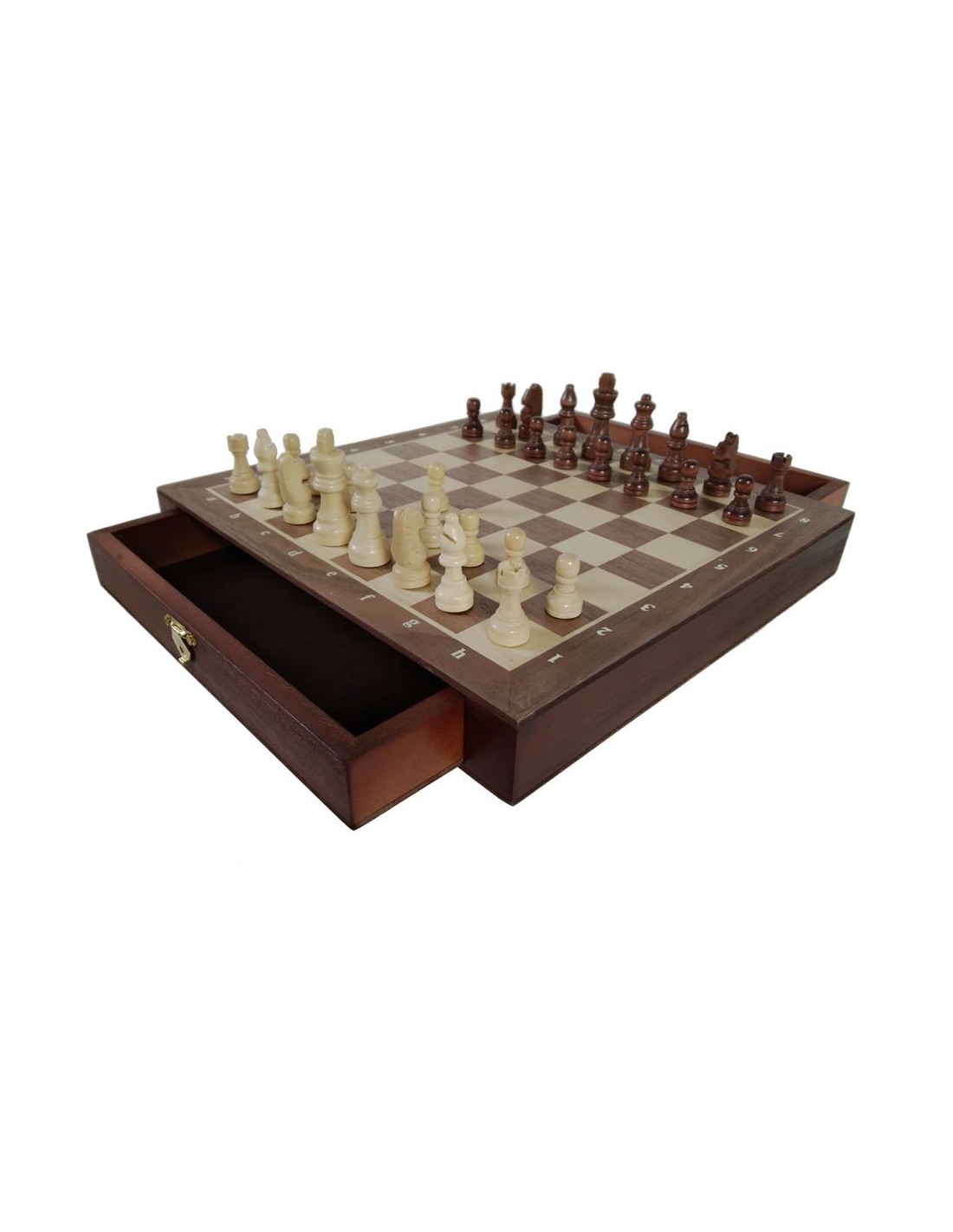 Jeu d'échecs en bois avec base magnétique et tiroirs latéraux, où stratégie, concentration et plaisir se conjuguent à chaque partie.