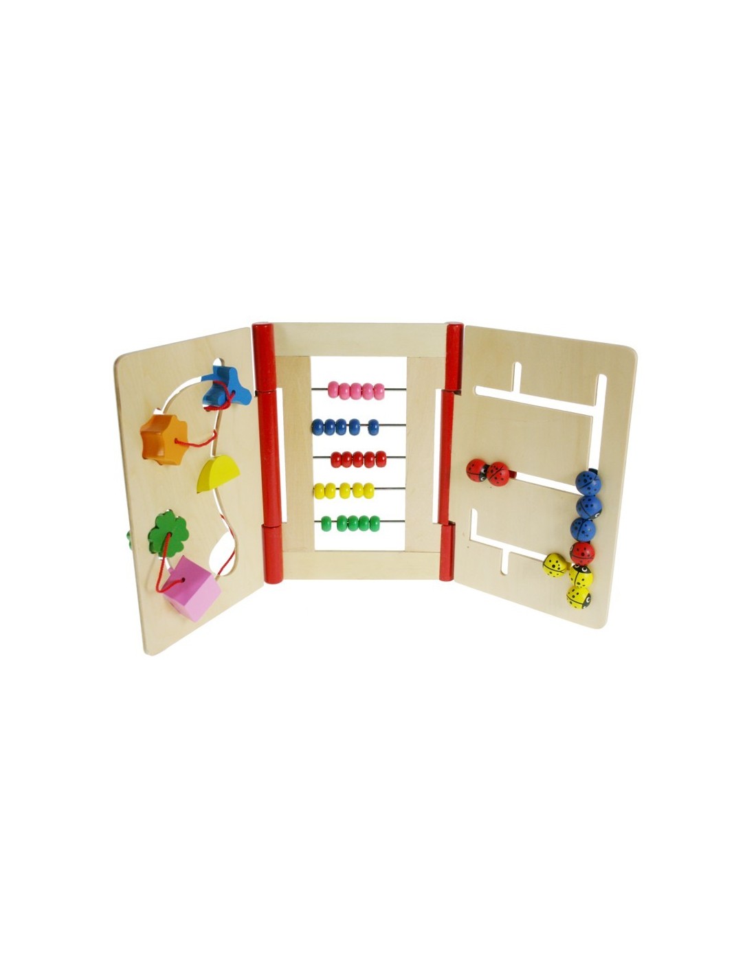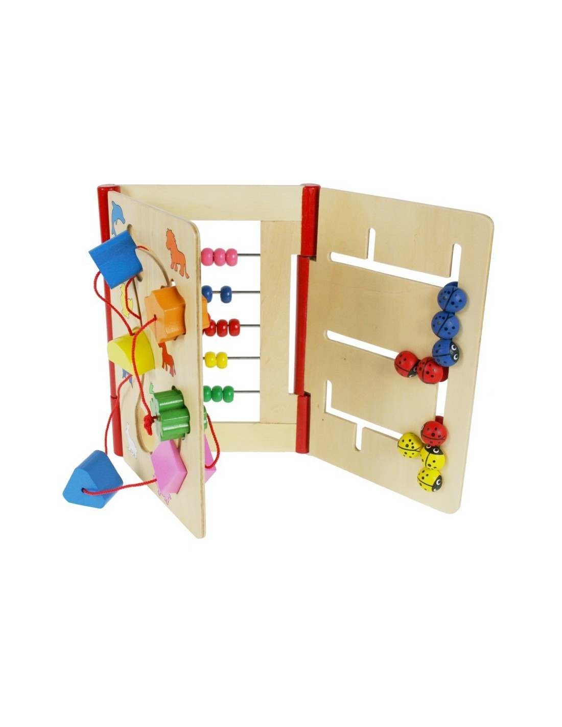 Le livre pour enfants en bois trouve des moyens. Jeu pour enfants pour développer et entraîner le mouvement des mains et la motricité, jouet à trois sections, l'une avec des formes coulissantes, l'autre avec des boules de calcul et un labyrinthe.