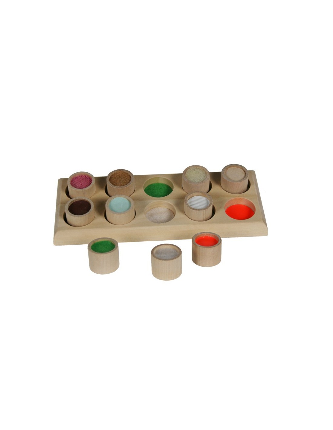 Le jeu comprend un plateau en bois dans lequel sont insérées des boîtes de conserve de différents matériaux et textures. Les enfants devront les reconnaître au toucher, ce qui stimulera leur concentration, leur attention et leur mémoire sensorielle.