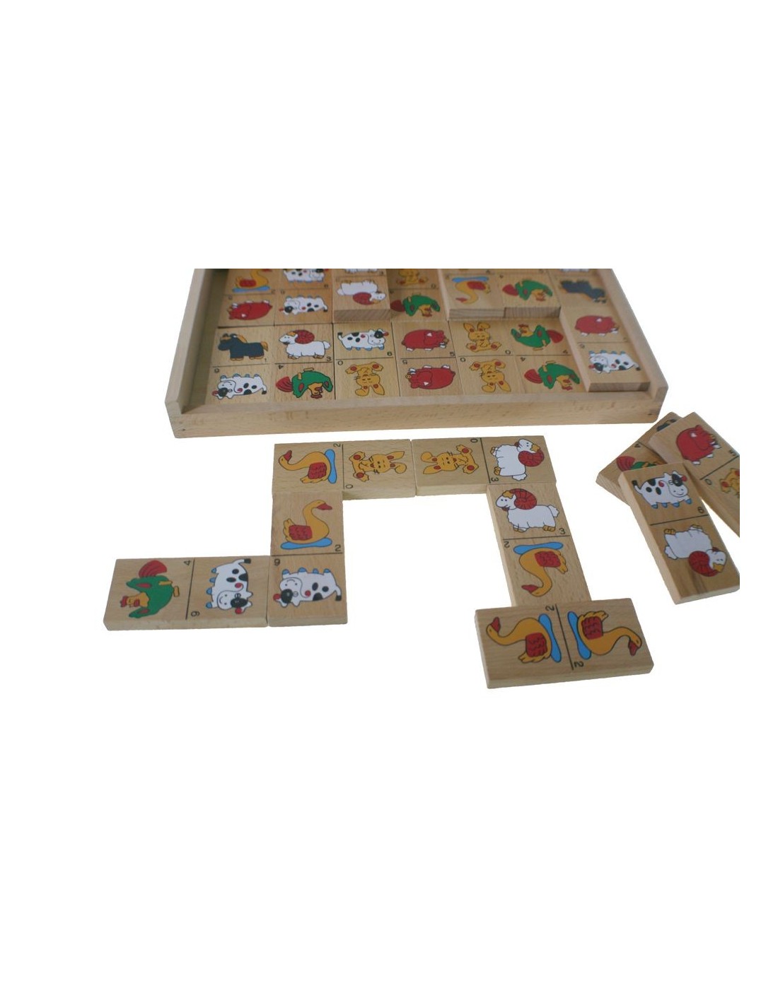Un domino en bois classique avec d'adorables illustrations d'animaux, idéal pour partager des moments de jeu tout en développant les capacités cognitives et la motricité fine.