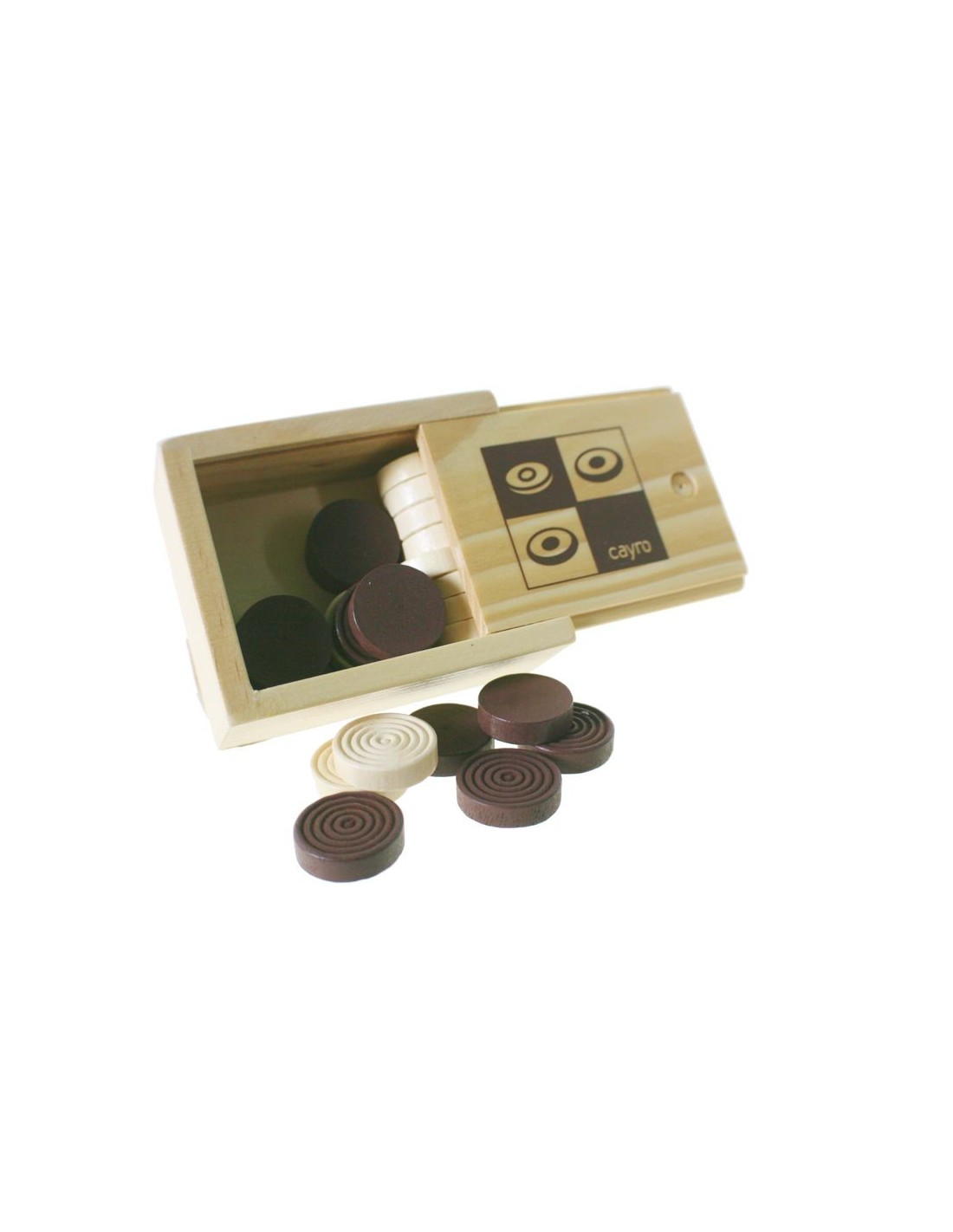 Accessoires, Dames en bois, 2 couleurs dans une boîte pour ranger 24 jetons de jeu de société. Dimensions : 4x10x8 cm.