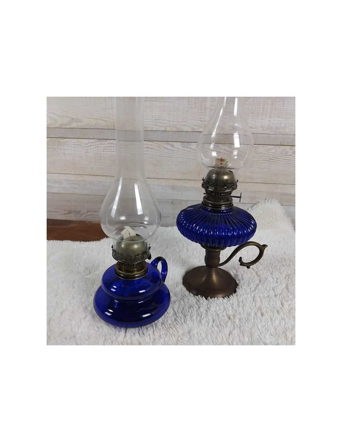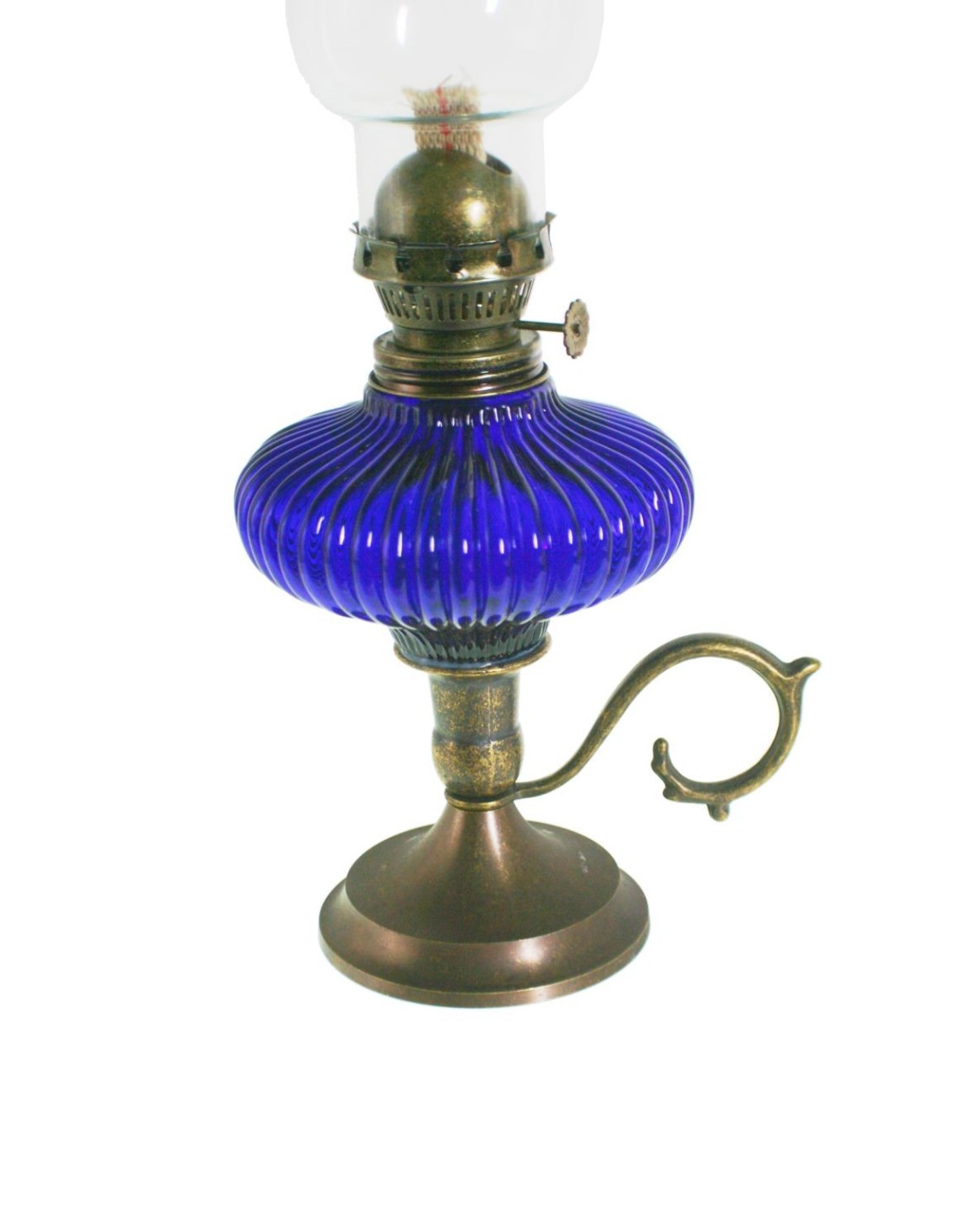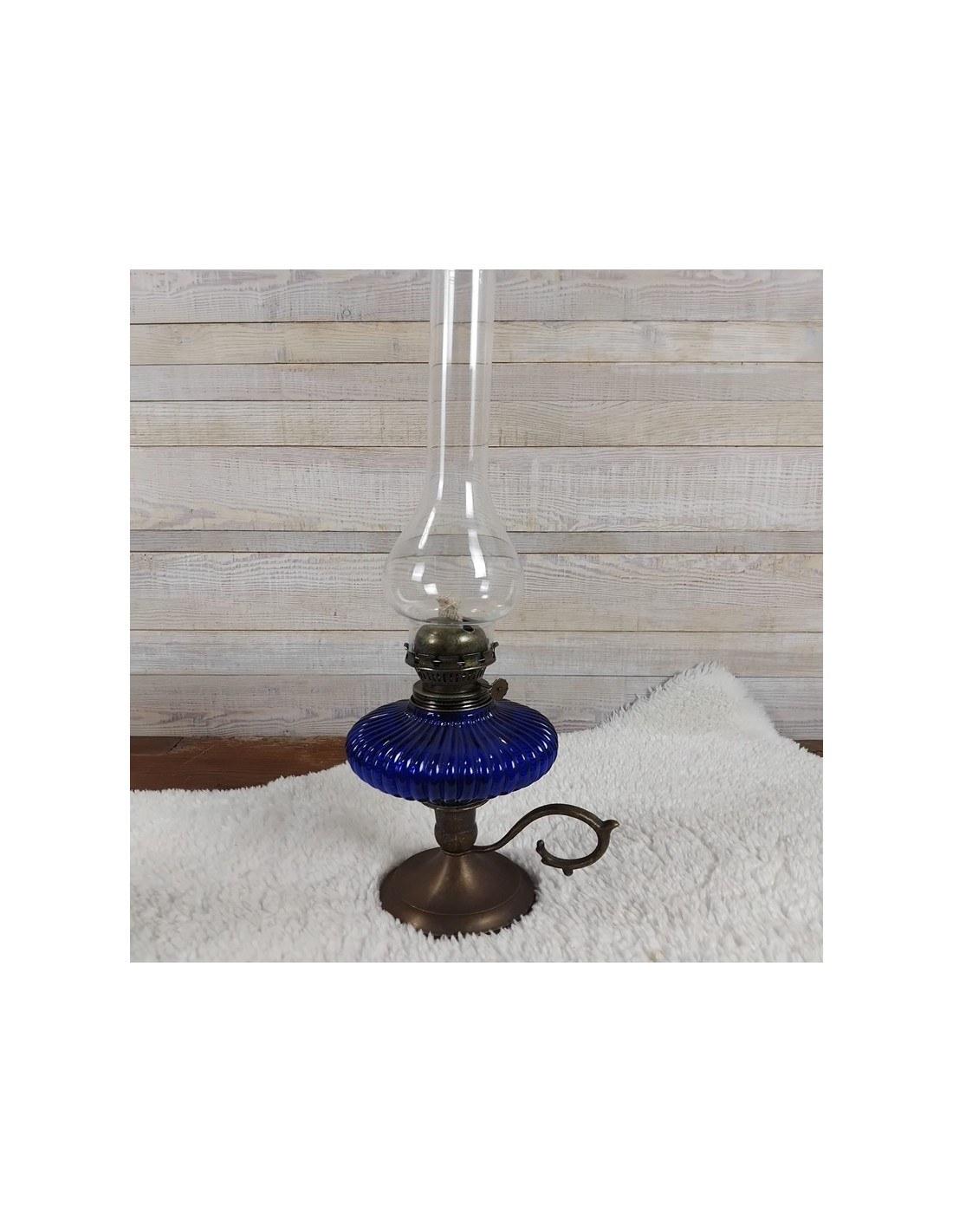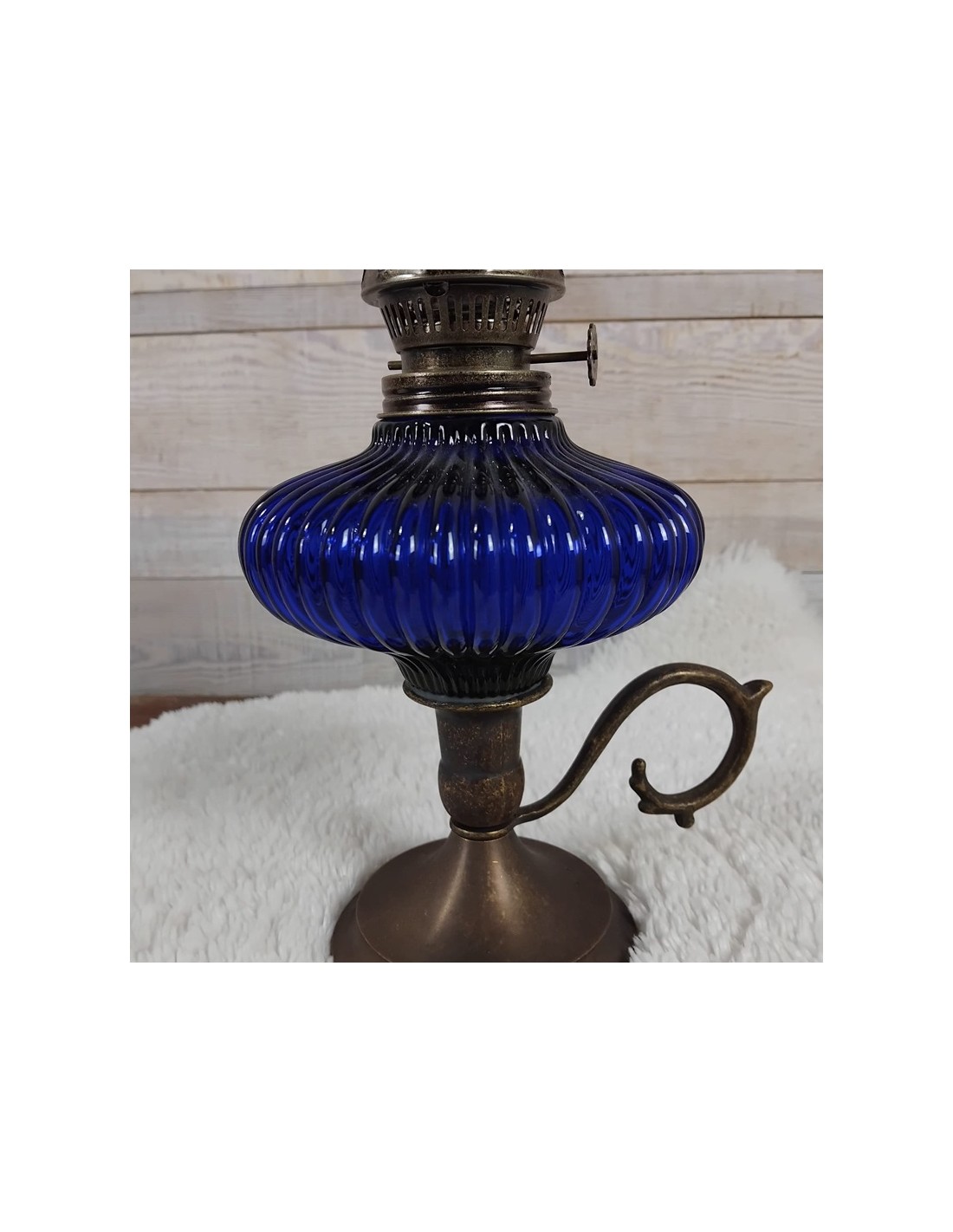 Lampe à huile à base de verre bleu avec poignée et abat-jour de décor de lampe à huile vintage. Dimensions: 47x16xØ12cm.