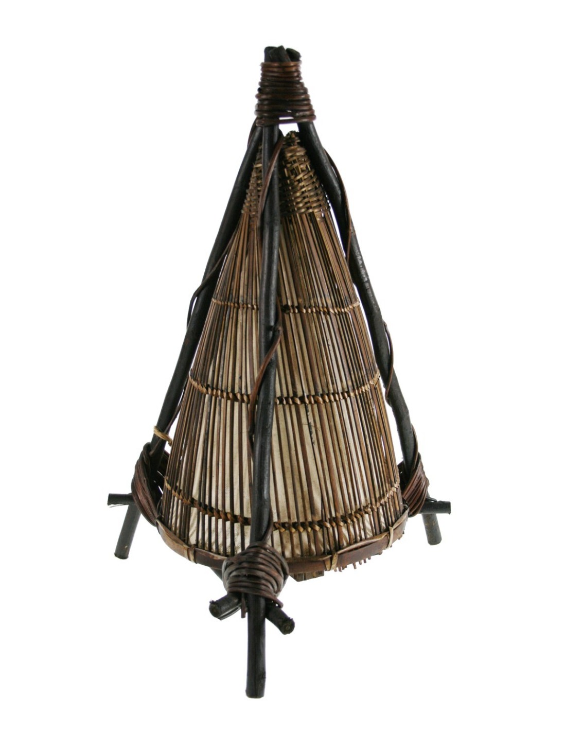 1.287 / 5.000 Lampe de table pyramidale en roseaux pour une décoration ethnique. Dimensions : 50 x 30 cm.