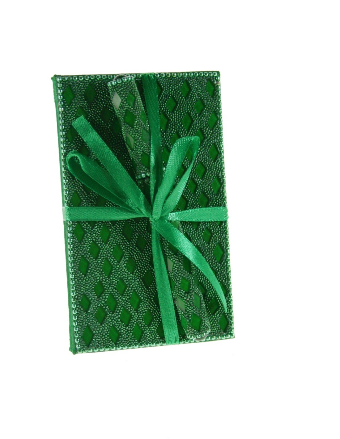 Petit carnet pour notes de poche et sac à main, avec des couvertures rigides avec des strass verts et un stylo à bille.