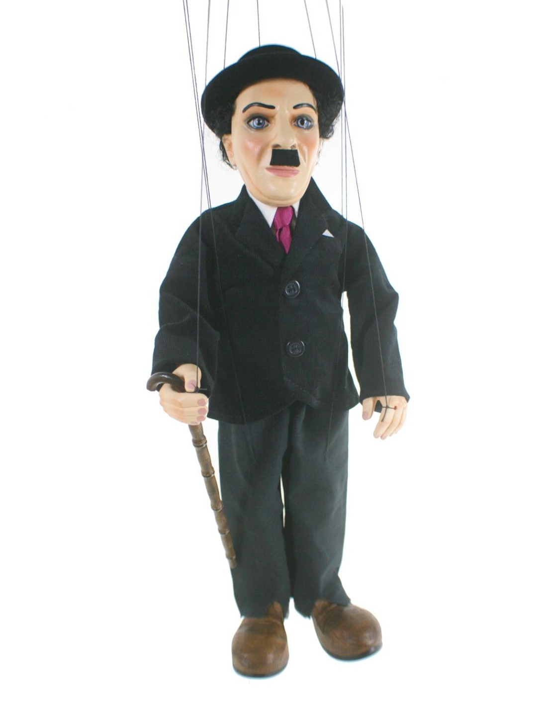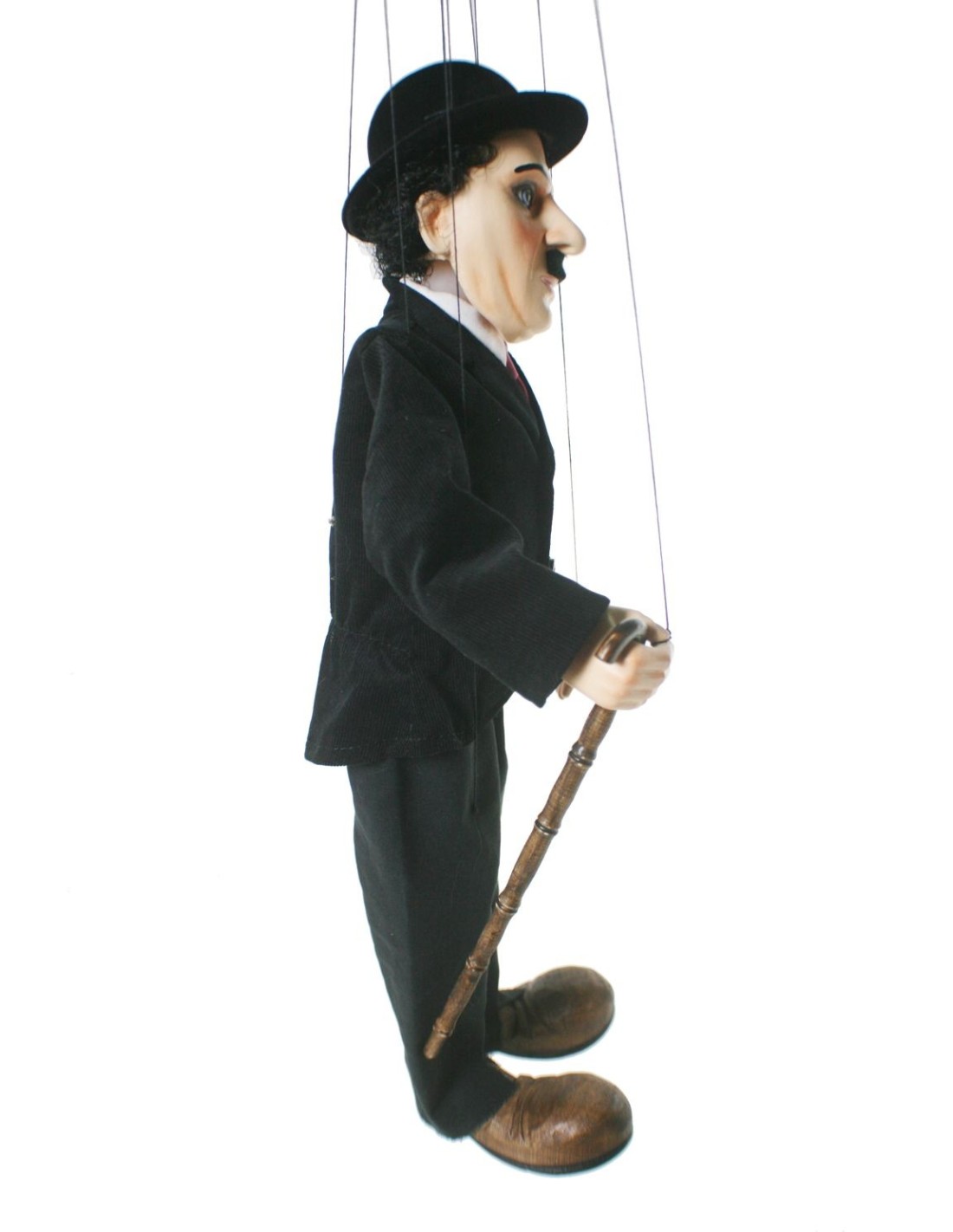 Marionnette artisanale CHAPLIN professionnelle en matériau rigide avec tige en métal, jambe et chaussure en bois sculpté et peint à la main.