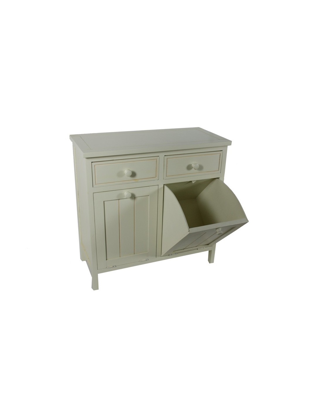 Ce meuble de salle de bain ou de buanderie blanc patiné est à la fois fonctionnel et décoratif. Il comprend des tiroirs supérieurs et deux compartiments inférieurs pour trier le linge sale avant le lavage en machine. Pièce d'exposition, il est donc disponible à un prix spécial.