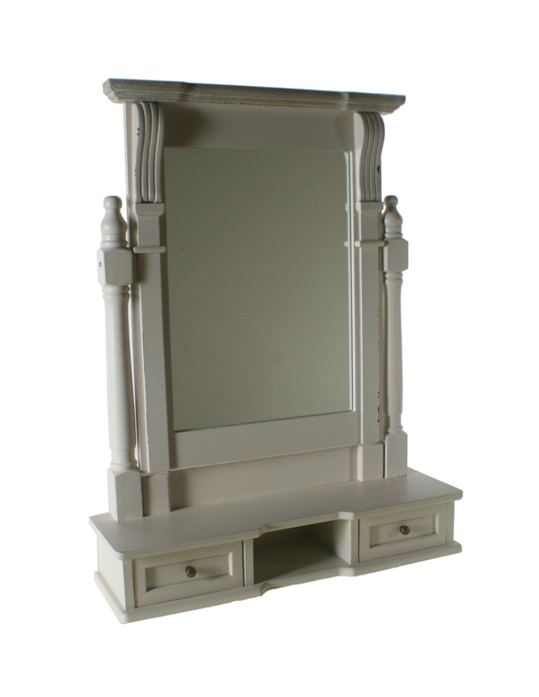 Une armoire à glace en bois au fini blanc légèrement vieilli, avec deux tiroirs latéraux et une étagère centrale faisant office de support pour le miroir, offrant une charmante touche rétro. Ce meuble offre non seulement de la fonctionnalité, mais apporte également une décoration chaleureuse à votre espace, promettant à la fois un excellent service et une esthétique accueillante.
