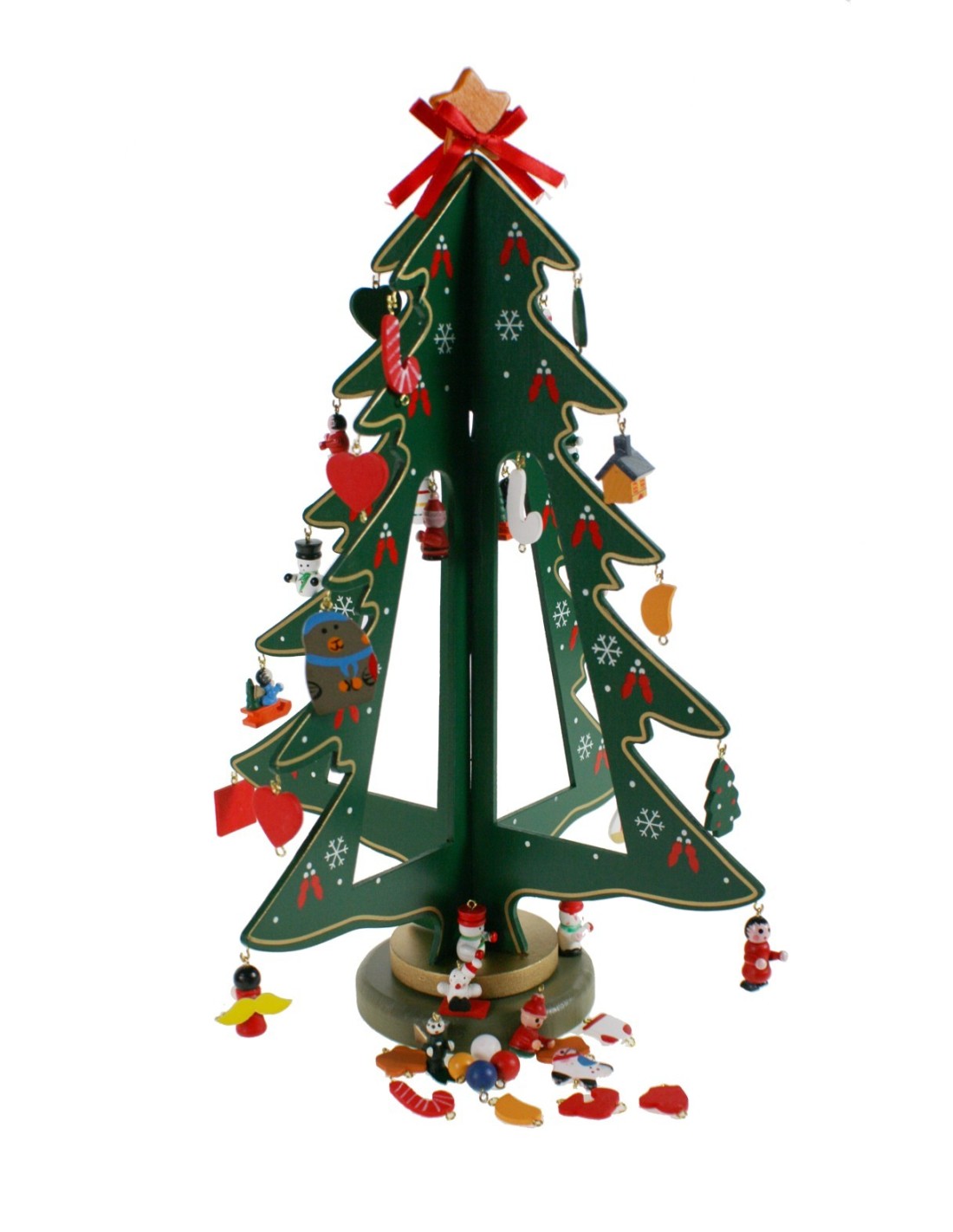 Sapin de Noël en bois décoré. Il peut être décoré de plusieurs façons avec les magnifiques pendentifs qu'il apporte. Même une étoile pour le pourboire vient avec. Un accroche-regard de la table de Noël. Qui veut décorer le sapin ? Cet arbre est idéal pour sa taille à mettre sur une table d'appoint. Dimensions totales : 39x30x30 cm.