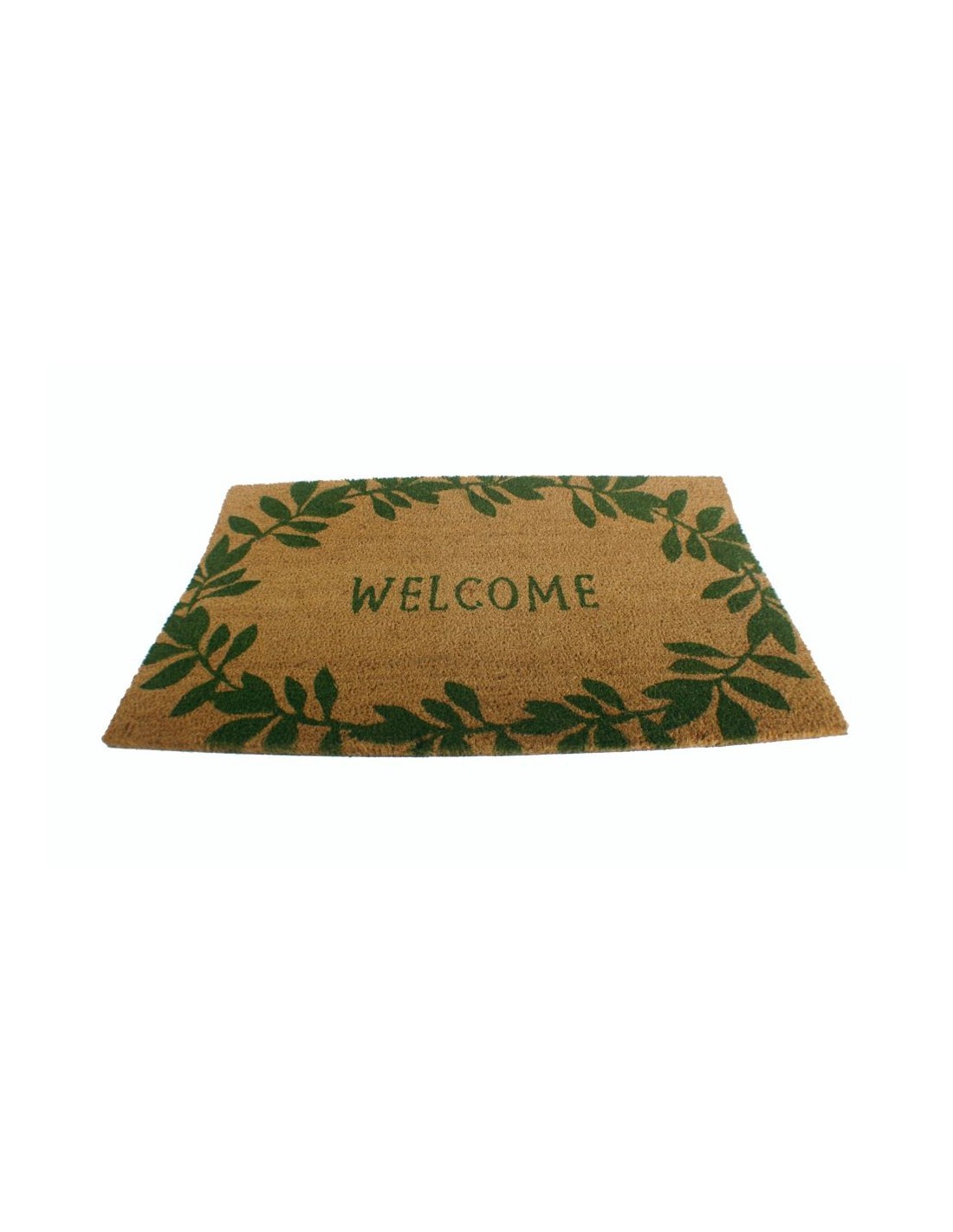 Grand paillasson rectangulaire en fibre de coco, idéal pour l'intérieur. Son design vert avec des fleurs et le mot "Bienvenue" apporte chaleur et style à l'entrée de votre maison, terrasse ou jardin.