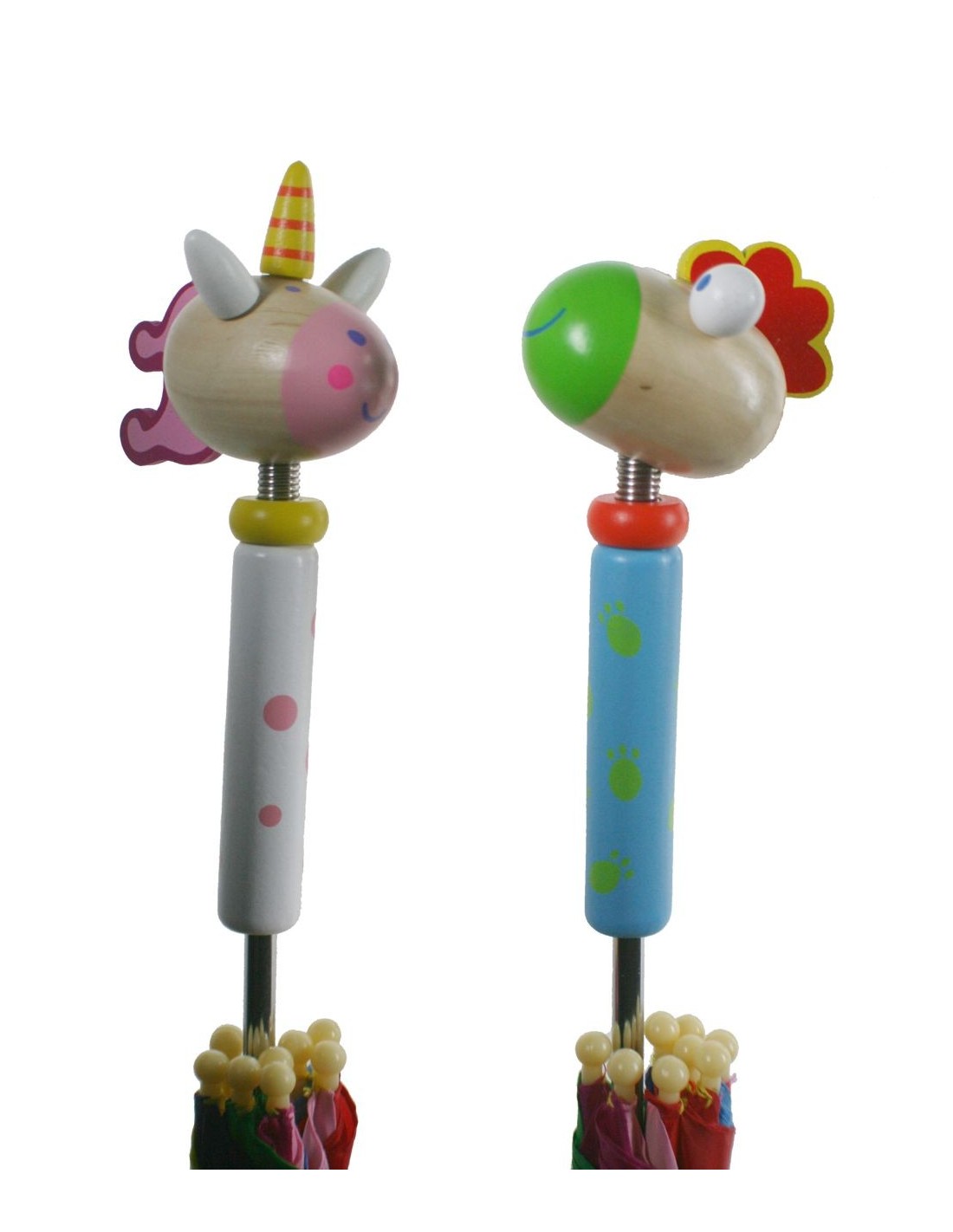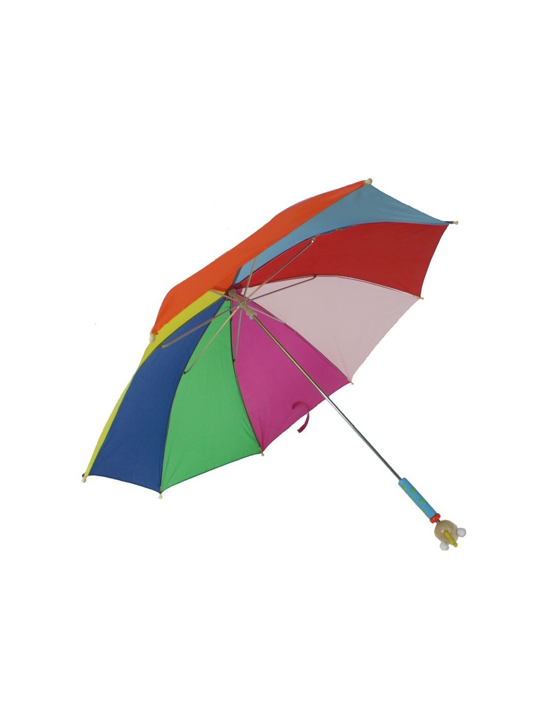 Parapluie pour enfants Rainbow. Beau design pour les jours pluvieux. Le manche avec une figure représentant la tête et la pointe d'un animal sont en bois vernis, le corps central et des tiges en métal chromé. L'ouverture non automatique pour plus de sécurité.