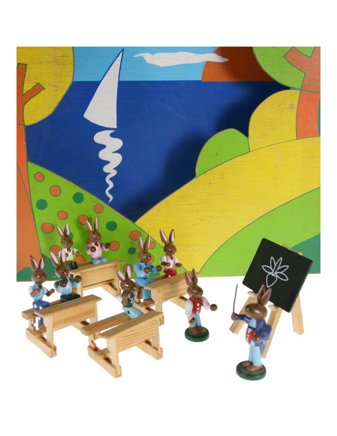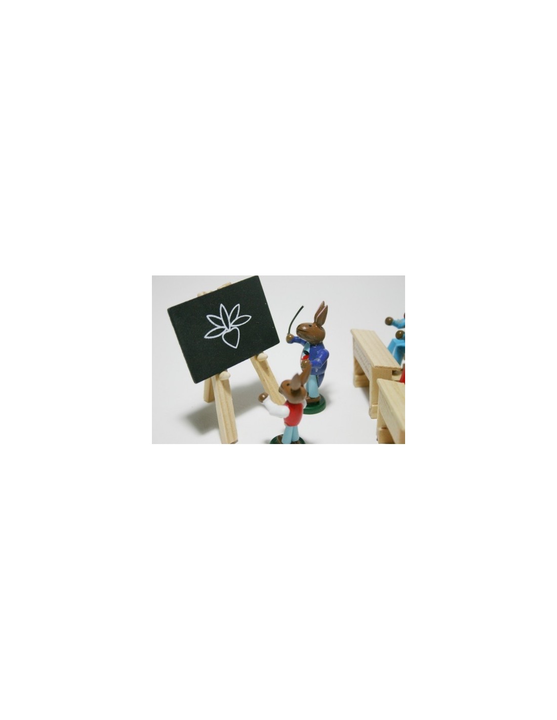 Lièvres en bois avec bureaux et professeur. Cadeau original pour un ou un professeur d'école et aussi une jolie décoration pour votre bibliothèque à la maison.