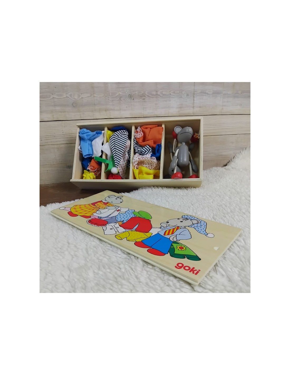 Cet adorable coffret comprend deux souris articulées en bois et huit tenues complètes avec boutons. Chaque article est conçu pour aider les tout-petits à exercer leurs doigts tout en s'amusant.