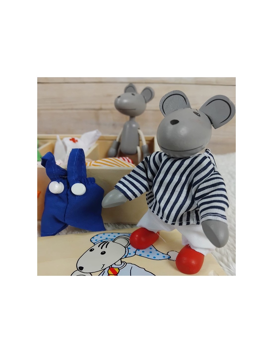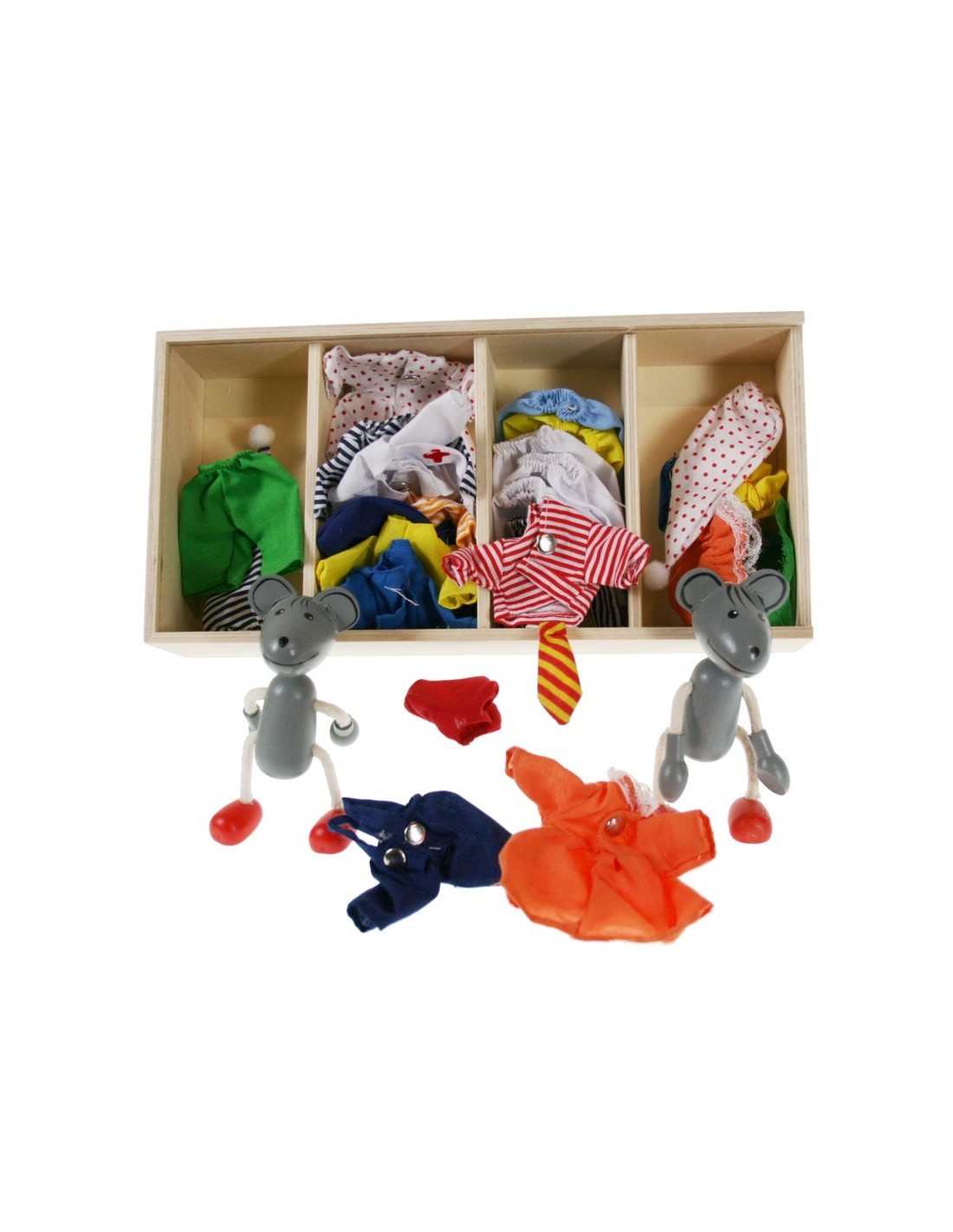 Coffret à vêtements avec souris articulées en bois et costumes - Jeu de motricité fine. Dimensions de la souris:11x6cm.