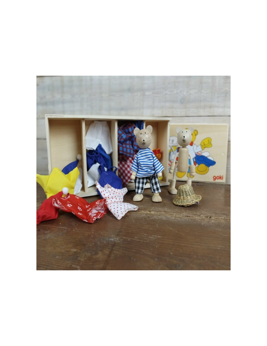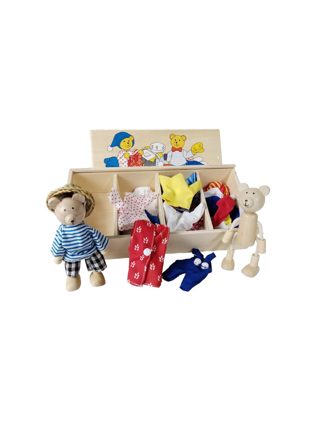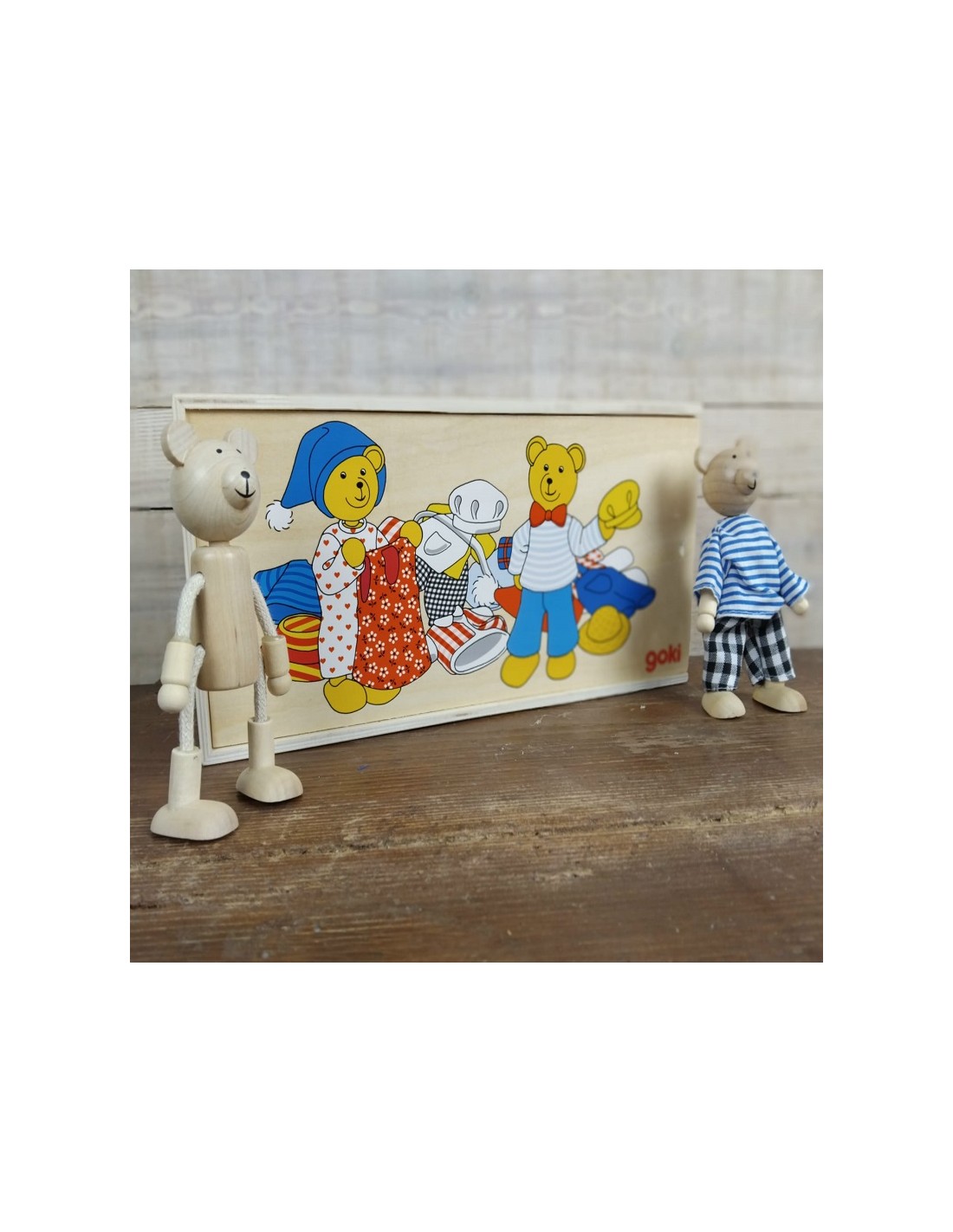 Ce coffret comprend deux charmants oursons en bois articulés, accompagnés d'ensembles de vêtements pour se déguiser et personnaliser. Un jeu classique qui encourage la créativité et aide les enfants à améliorer leur coordination et leur motricité.