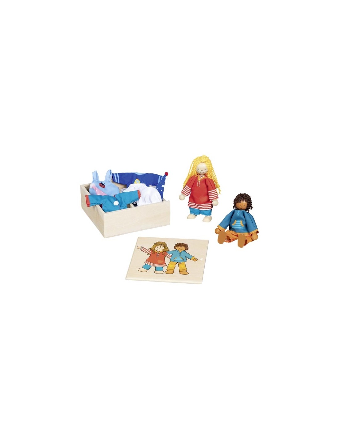 Deux poupées en bois (garçon et fille) avec six tenues modernes. Idéal pour développer la motricité fine et l'imagination des tout-petits.