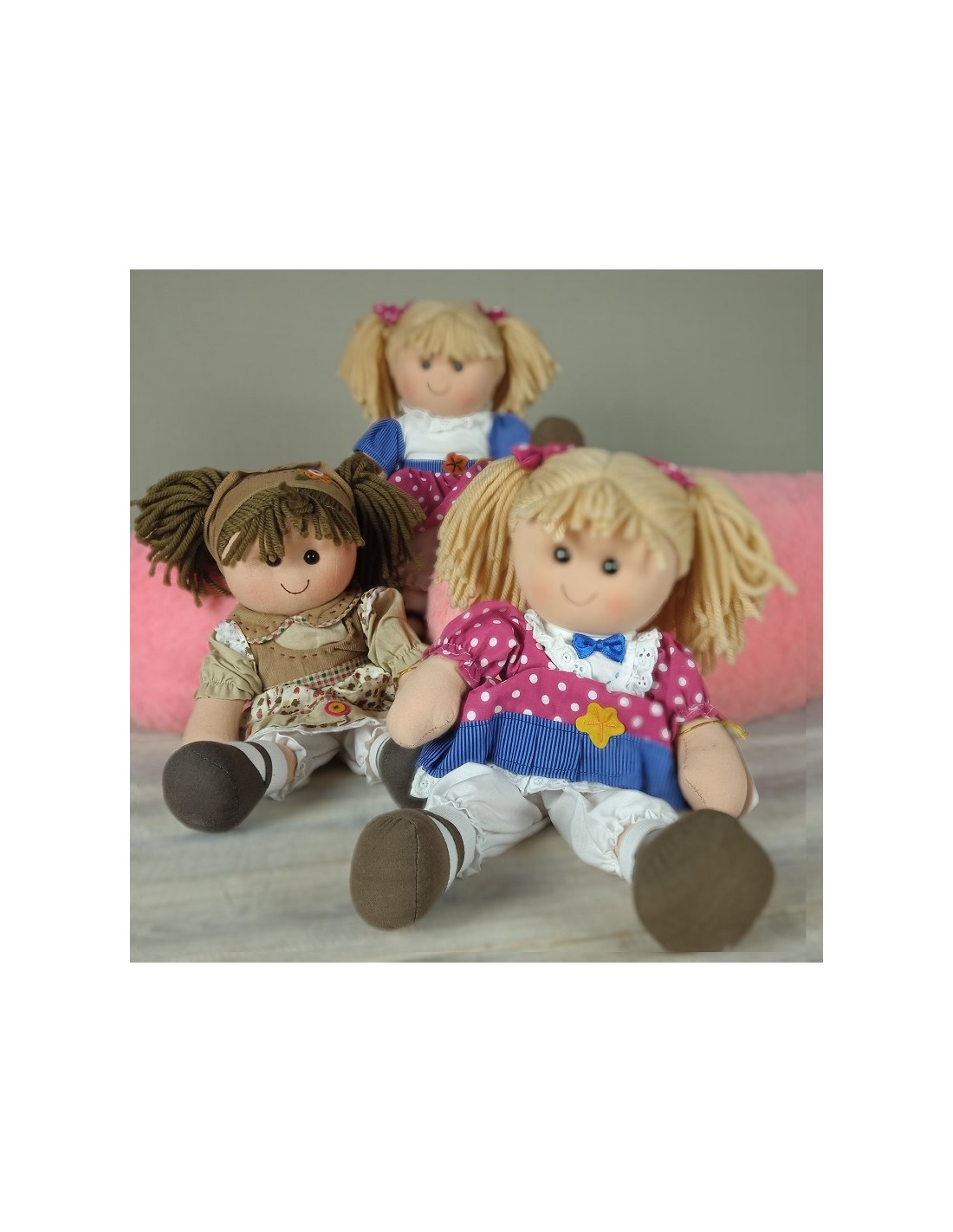 Lydia est une jolie poupée de chiffon avec des couettes blondes et un look charmant. Ses vêtements en tissu et sa dentelle délicate rappellent les poupées traditionnelles fabriquées avec amour et soin.